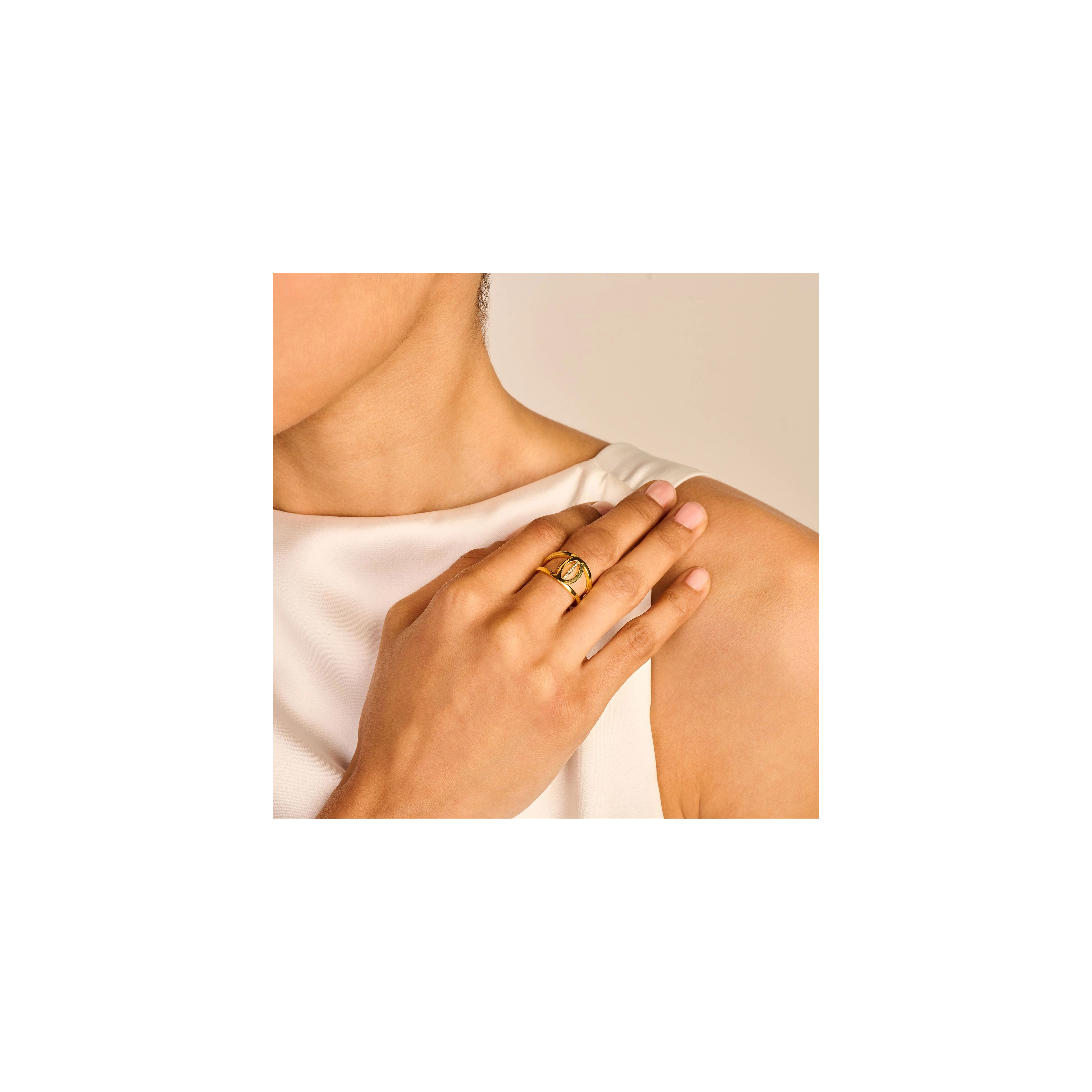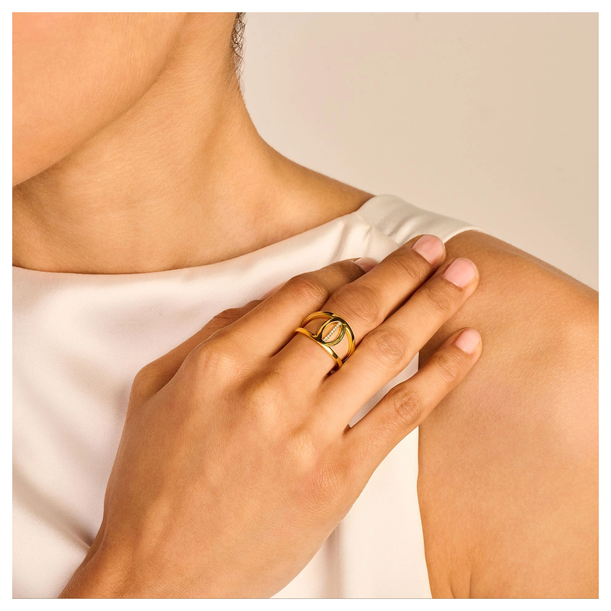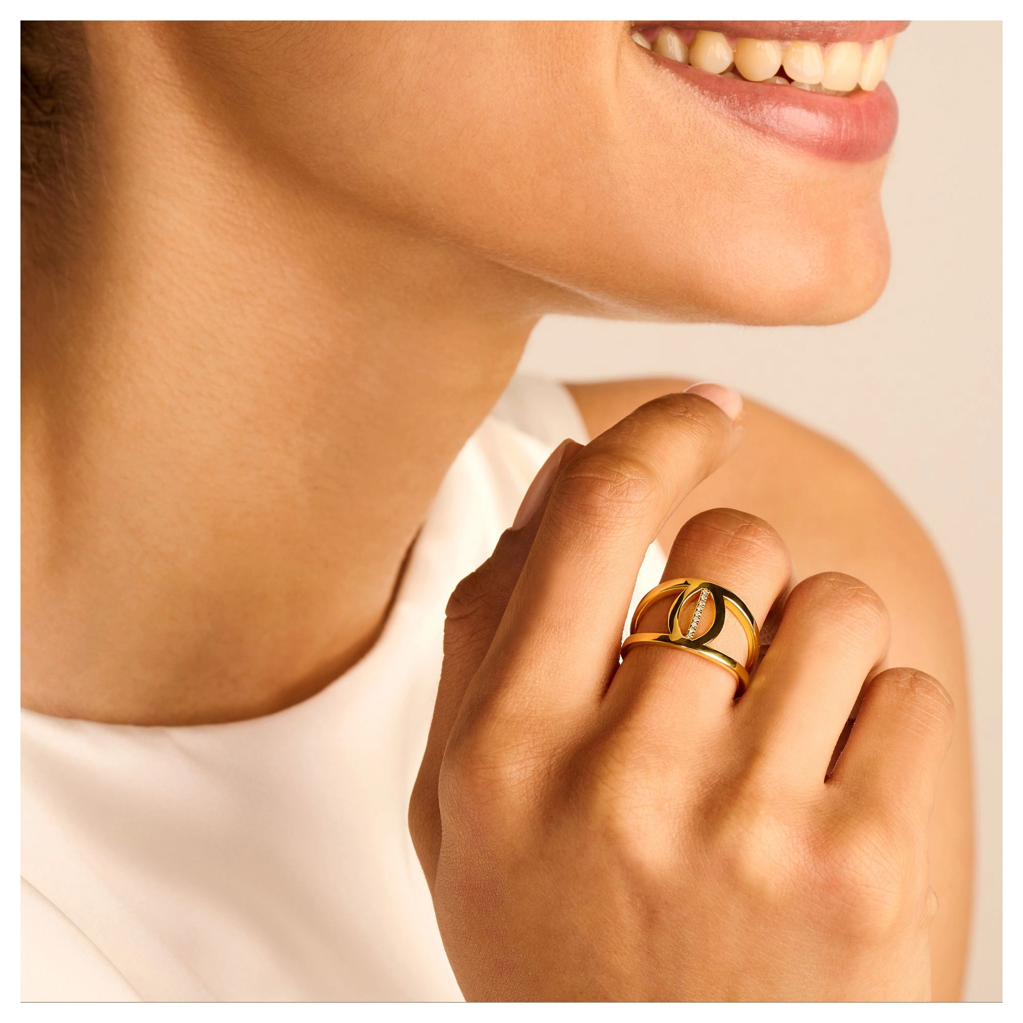 A curved cut-out style shank with a contrasting straight centerpiece, handset with 9x illuminating diamonds. It’s a modern statement piece to get in a mad dash about.