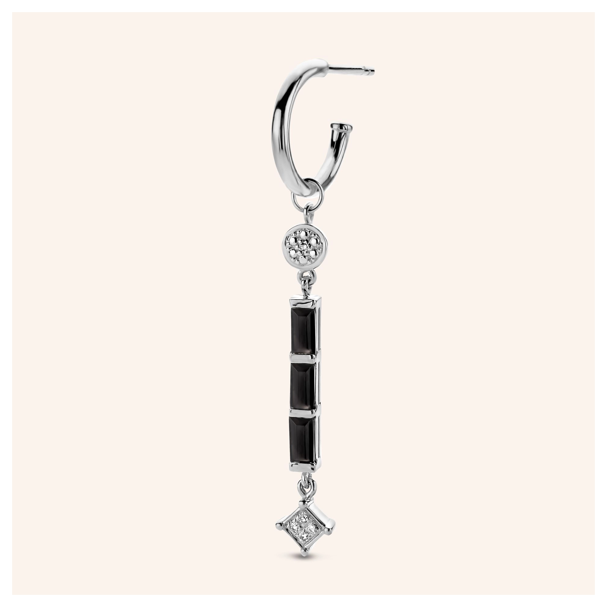 Escape into the darkness of the night. A slick and mysterious hoop earring, mixing different shapes and gemstones: a powerful bar of black Onyx baguettes, topped off with 5x alluring diamonds. 'Cause diamonds are the new black. Perfect to match up with our Secret Twilight single earring and Twilight stud.