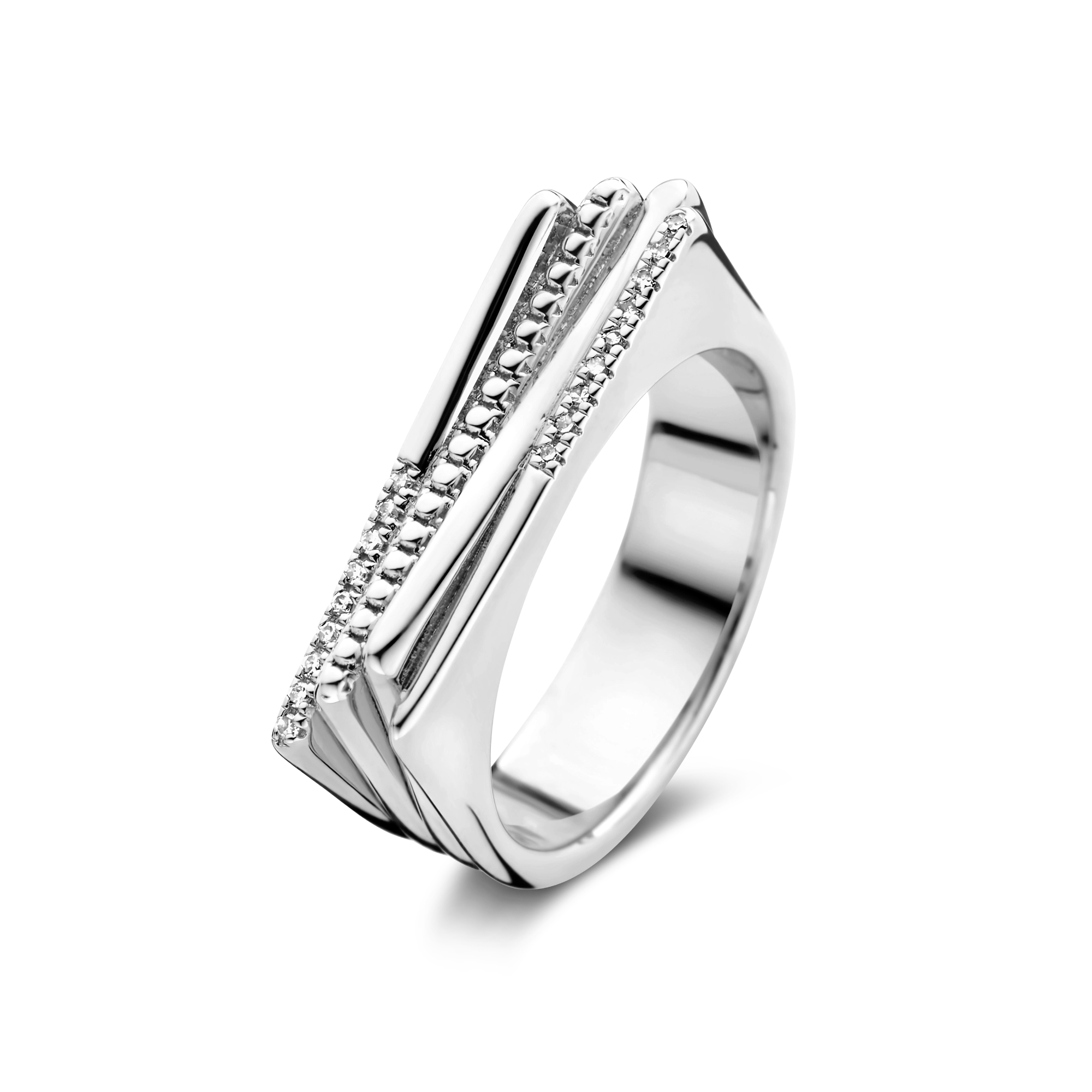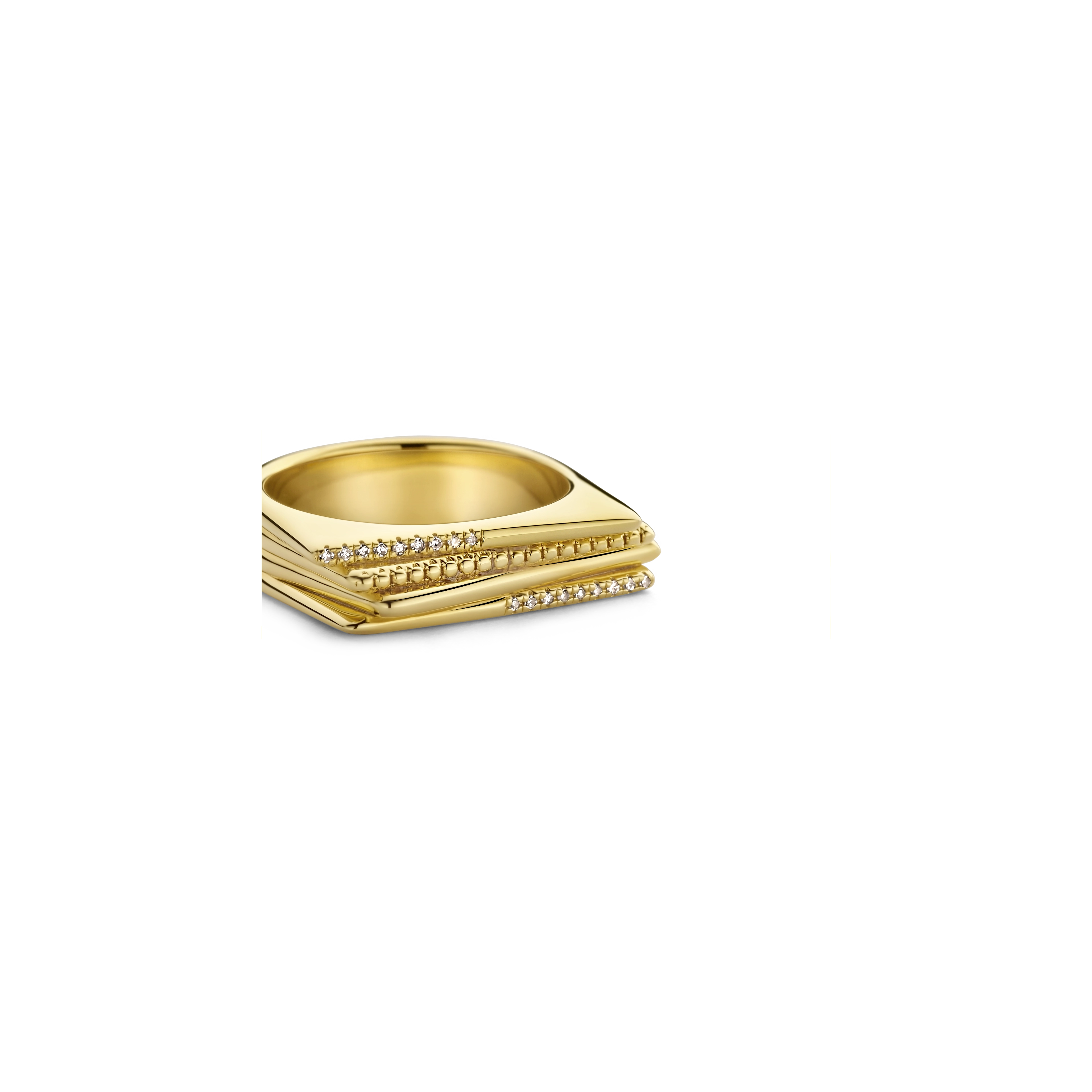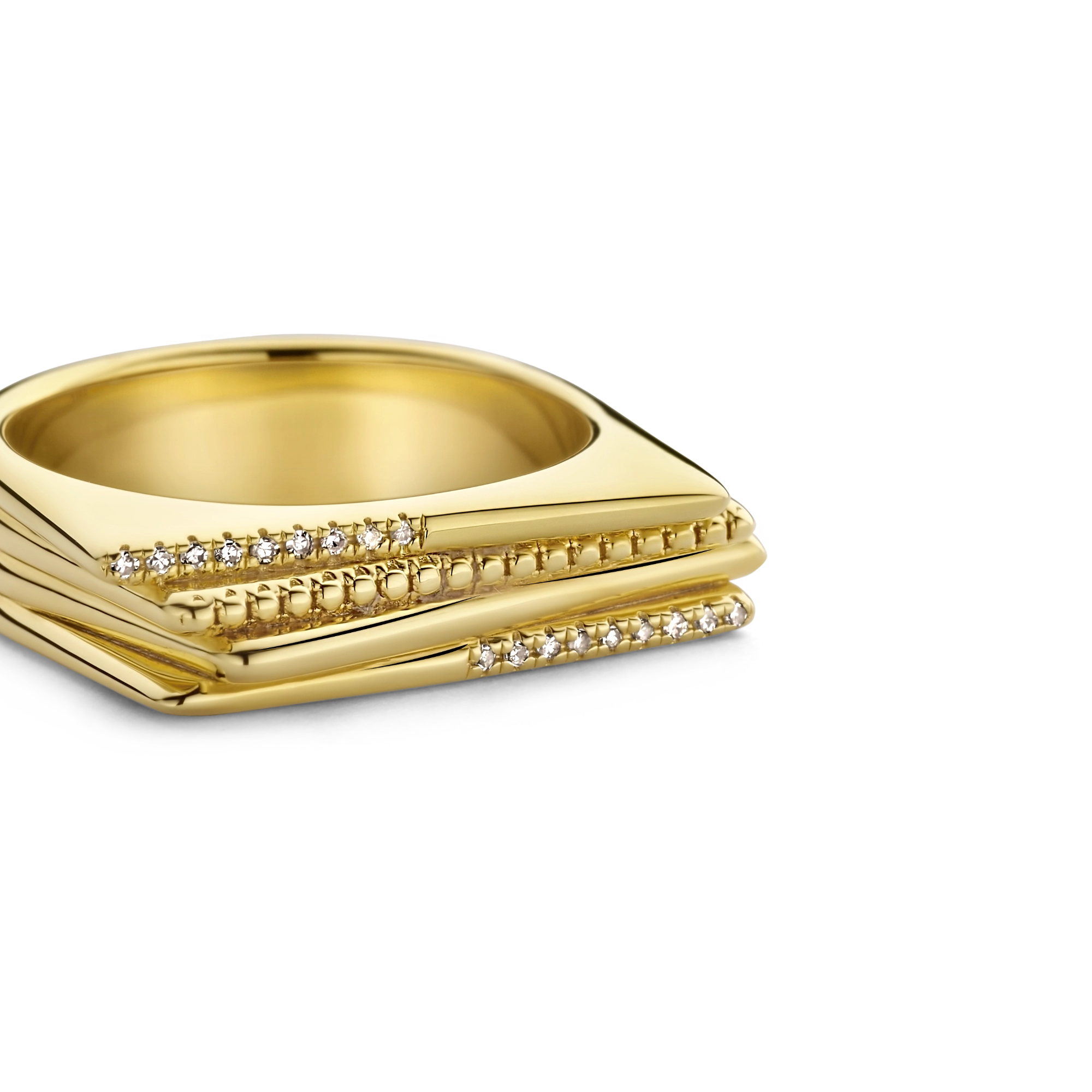 Behold - a magnificent quartet ring, crafted of trapeze bars. One plain and polished, the other finished with milgrain detailing, both wrapped by diamond shanks. The razzle-dazzle glow of 18x natural diamonds, matching all the shine of a thousand spotlights.