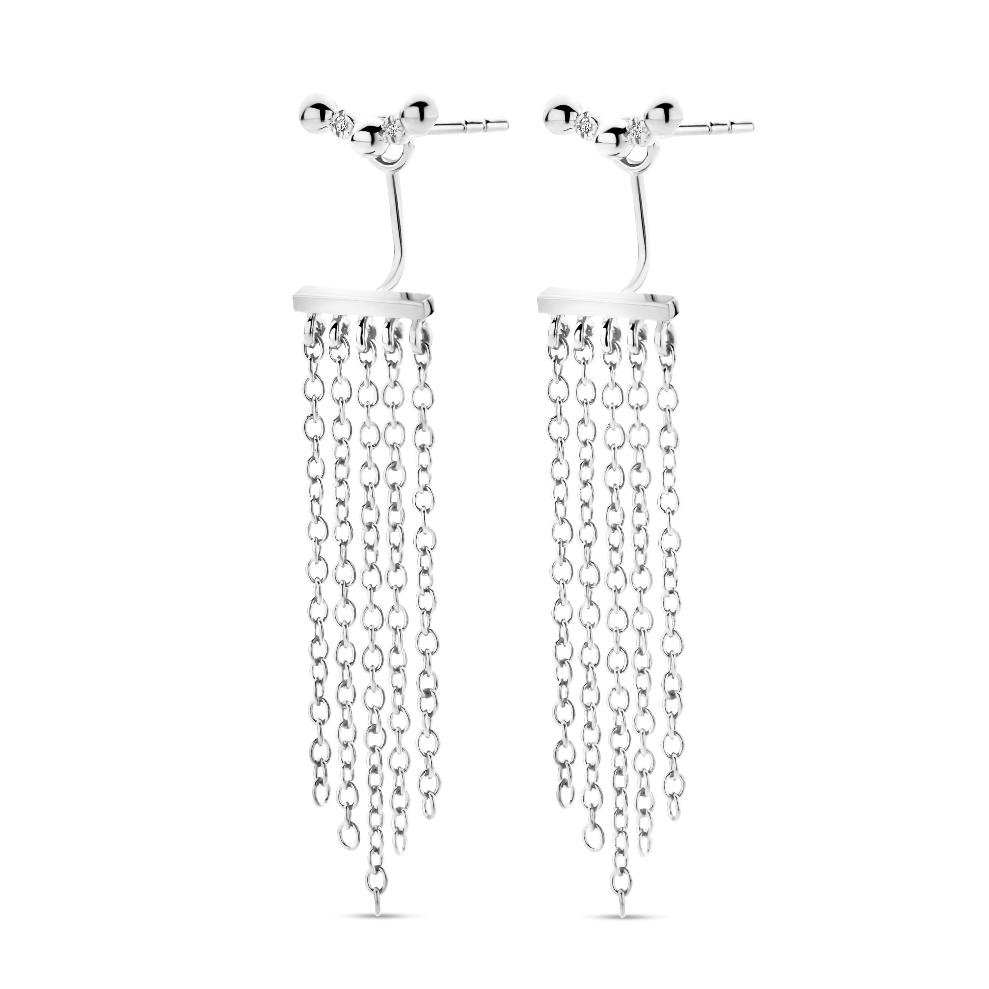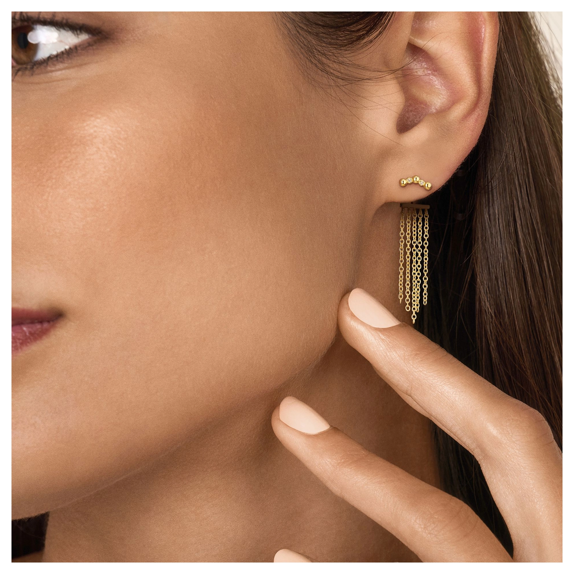 A dainty diamond (4x) curve stud-piece, accessorized with a waterfall of chains – inspired by the calmness of a gentle breeze and soft waves as they break upon the shore. STYLING TIP To be worn with or without its chain accessory, this versatile pair of earrings also doubles as everyday diamond studs. Create a continuous flow of diamonds by mixing the wave single stud as an additional piercing to the mix.