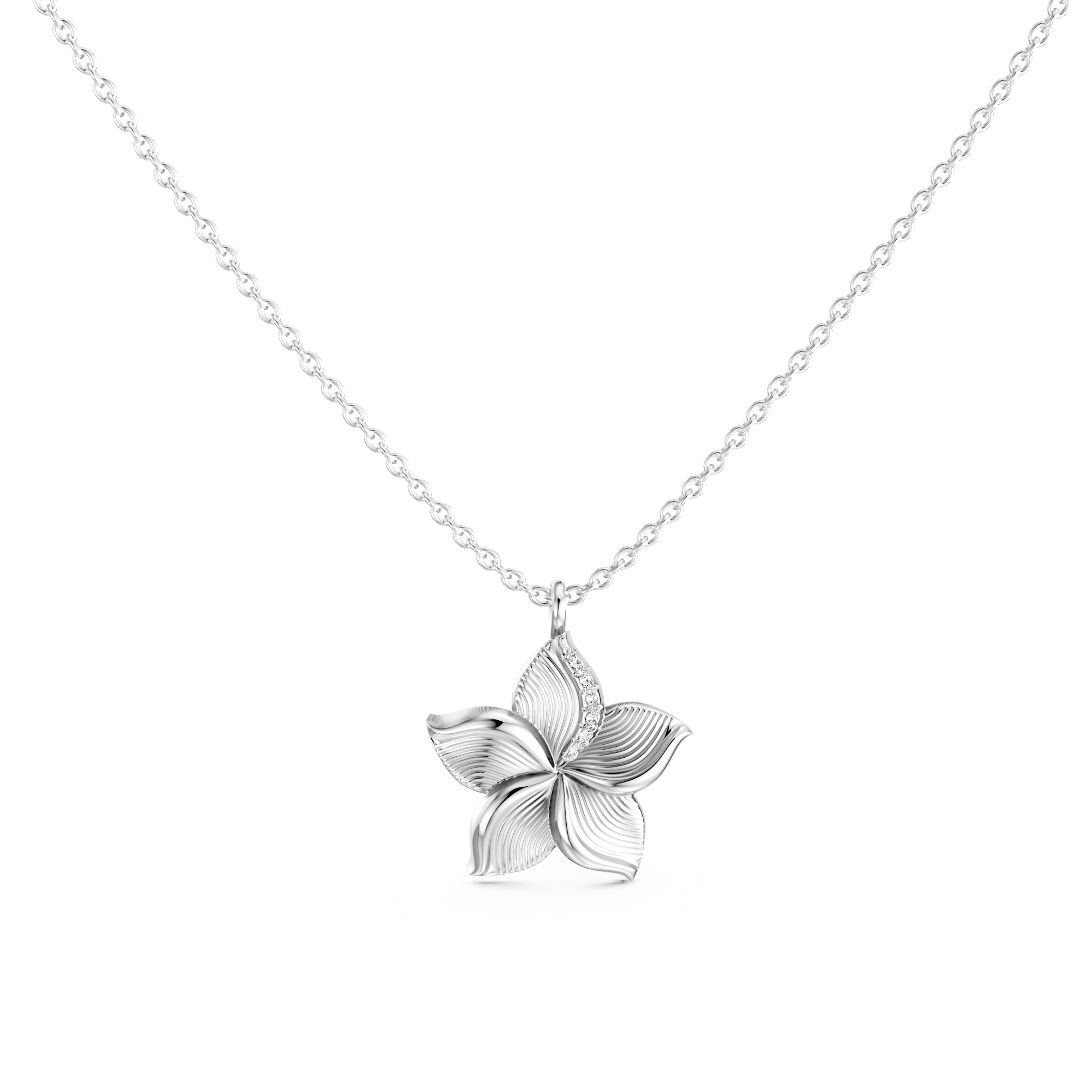 Graceful and timeless, this necklace showcases a floral pendant accented with seven white diamonds. The sculptural design adds depth and texture, while the soft sparkle keeps it elegant. Crafted in 925 sterling silver, it’s perfect worn solo or layered.