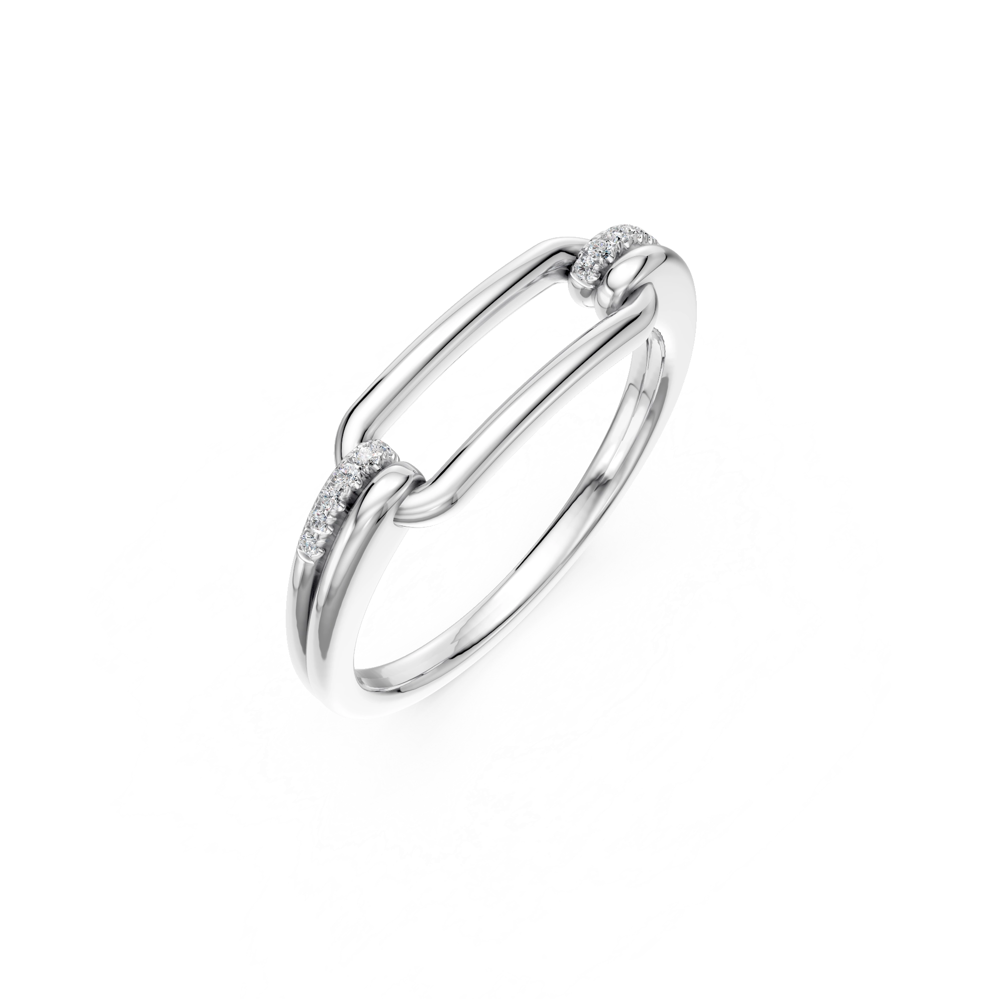 Understated yet distinctive, this ring plays with clean geometry and soft sparkle. Twelve white diamonds are set into a sleek, link-shaped silhouette, catching the light with every movement. Crafted in 925 sterling silver, it’s easy to wear and quietly confident.
