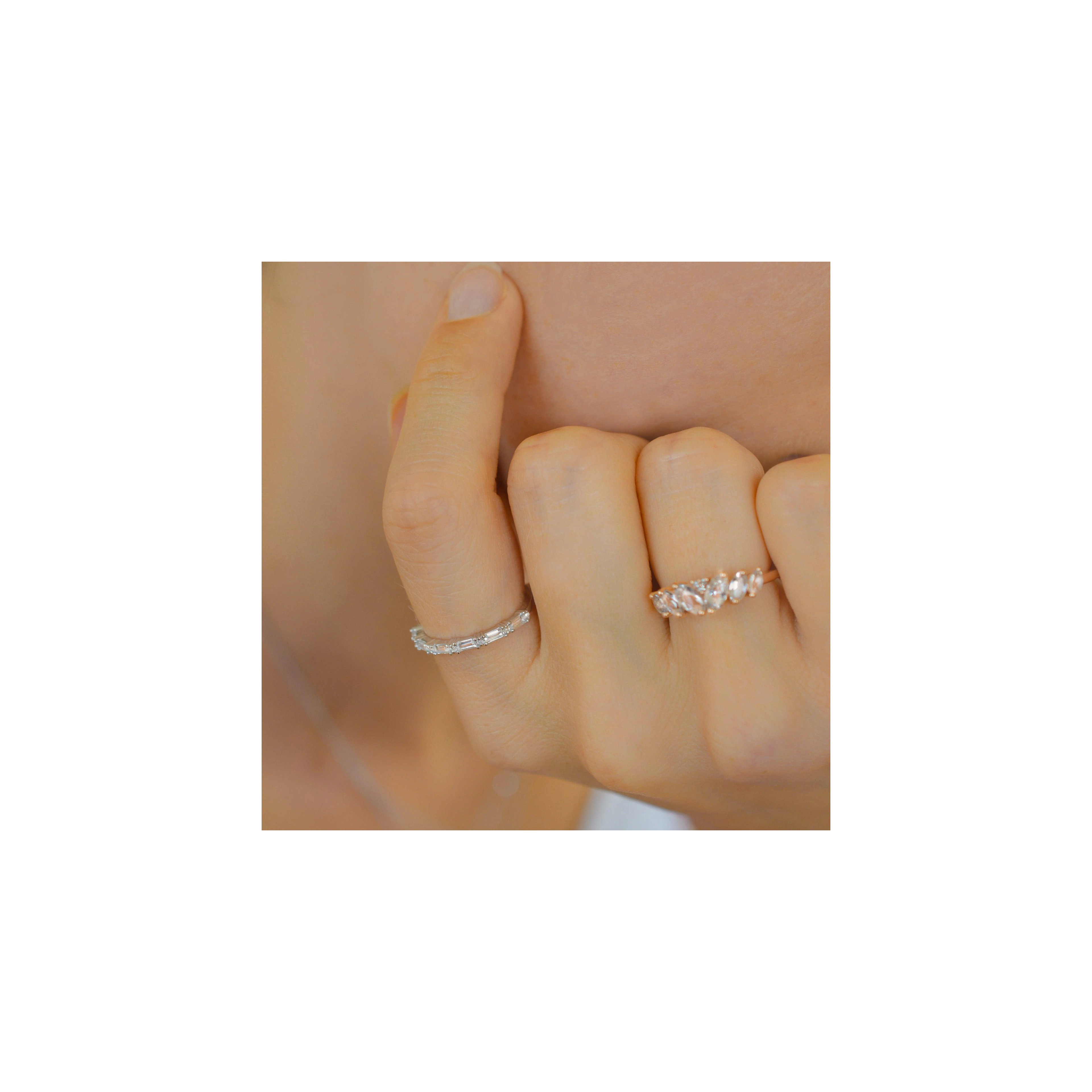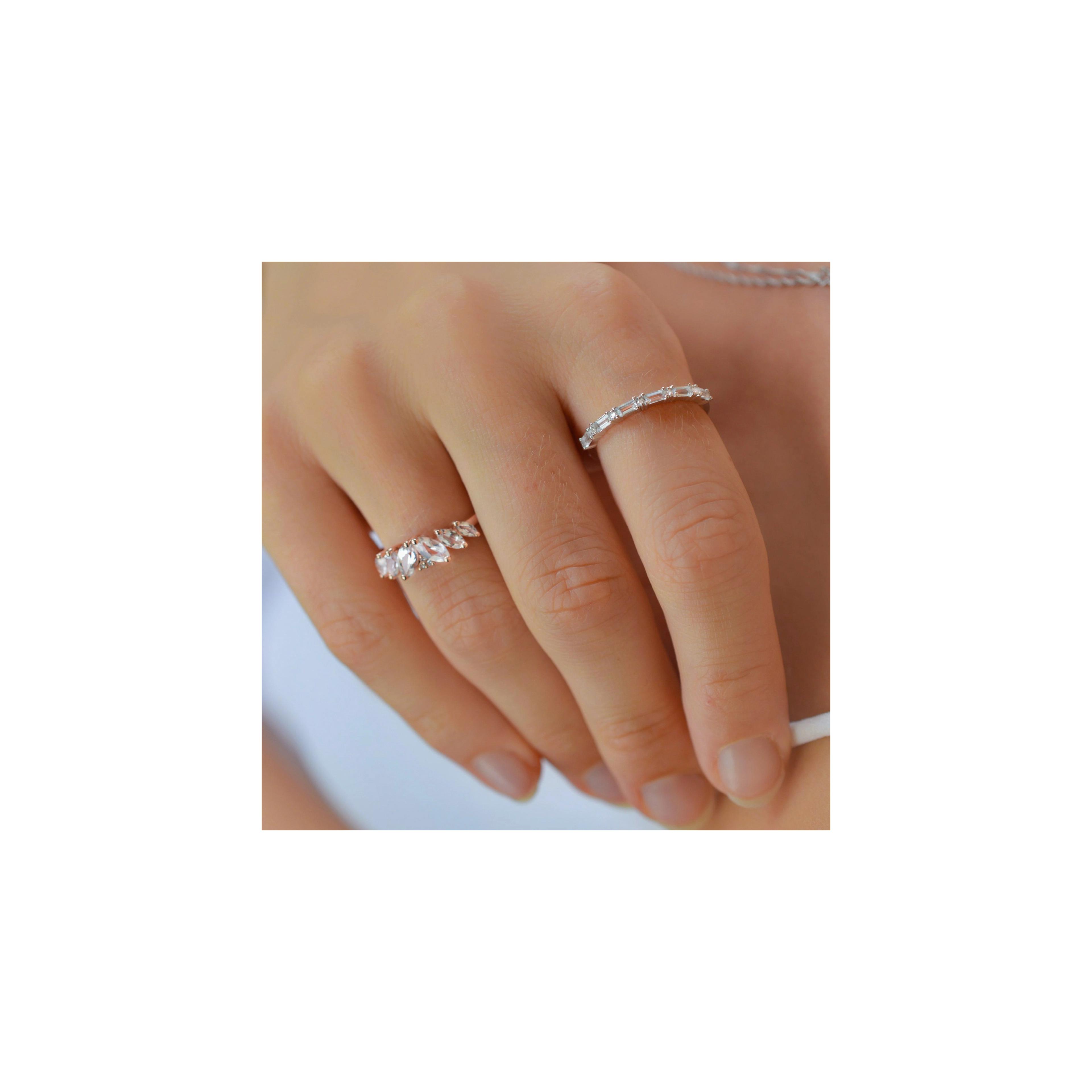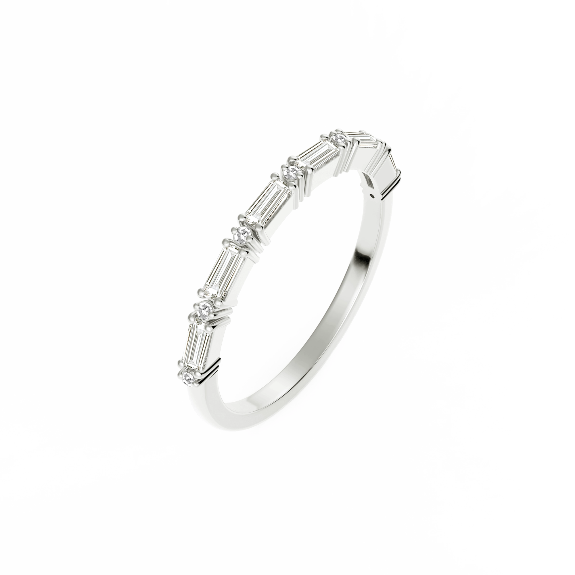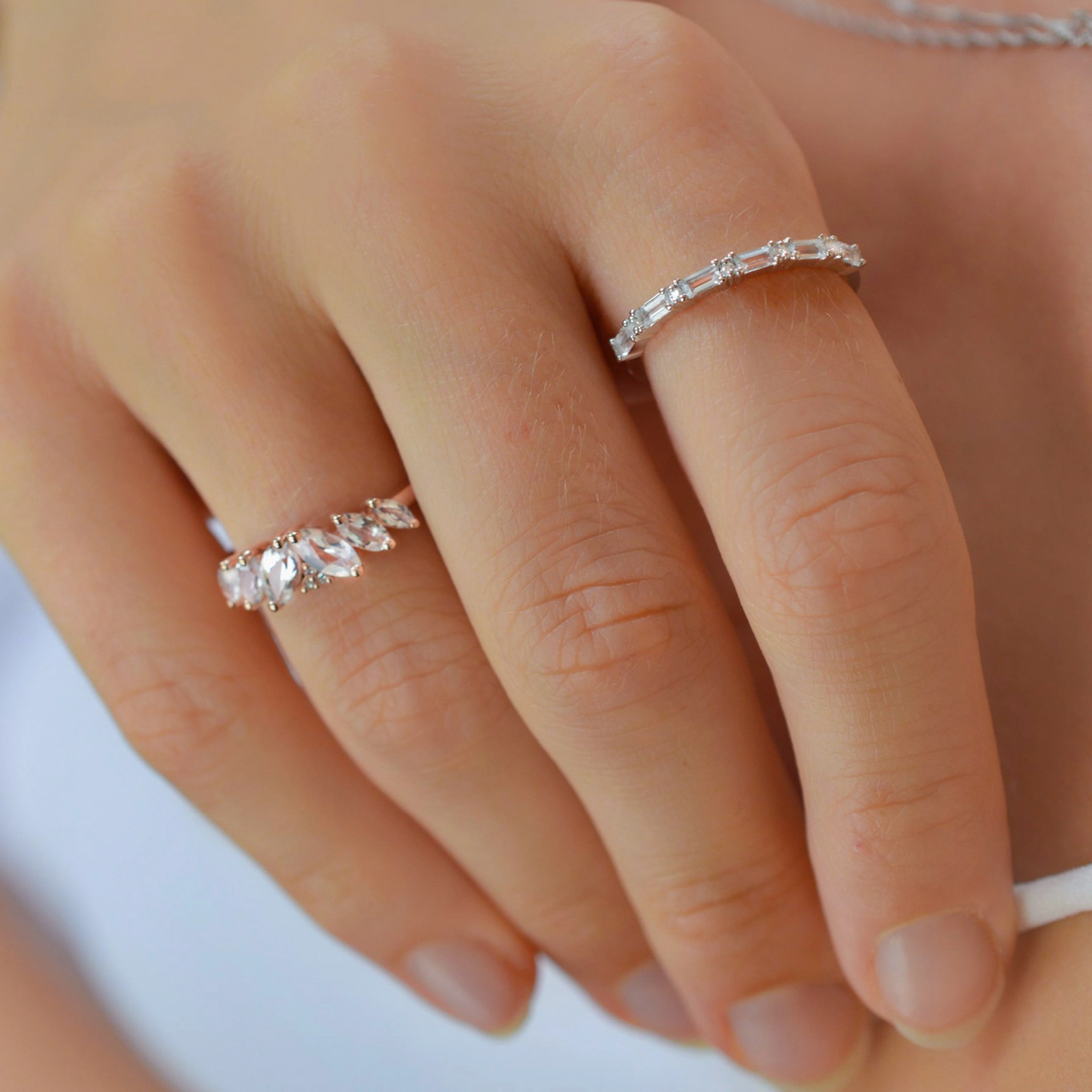 The ultimate token for true love birds. 6x baguette-cut white Topazes hand in hand with 7x white diamonds in a beloved eternity band. Forever has now begun.