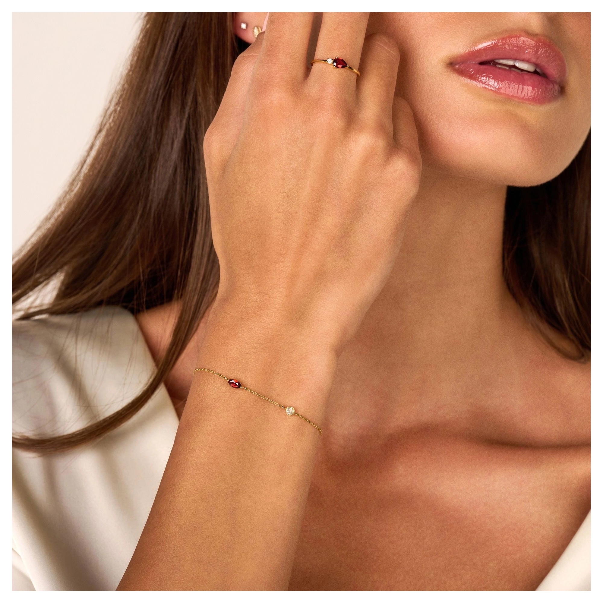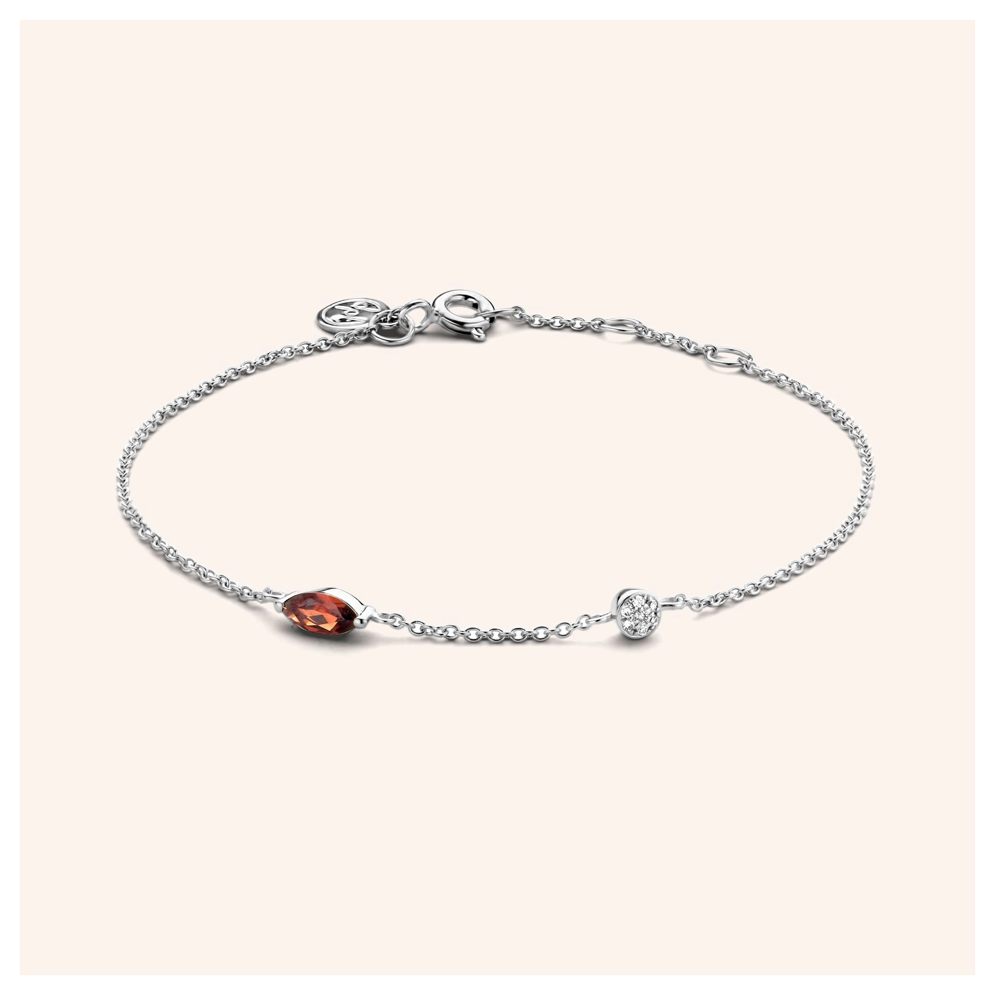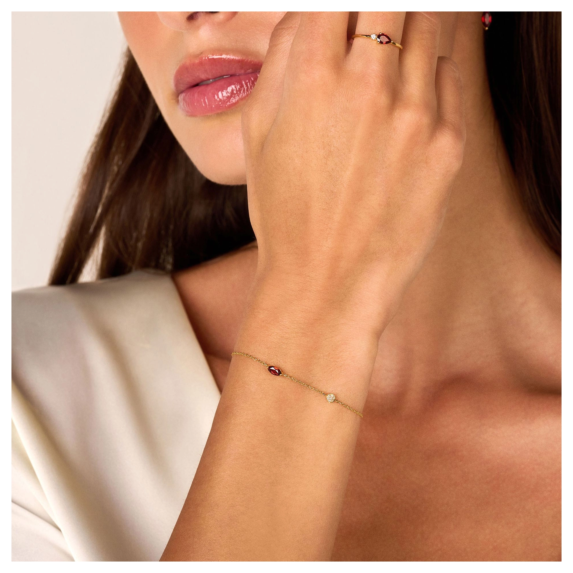 Reminiscing the glorious golden days, this fine marquise-shaped red Garnet is the beating heart of this 14 carat gold bracelet. Representing true grandeur by its luxurious ornament, featuring 7x white diamonds.