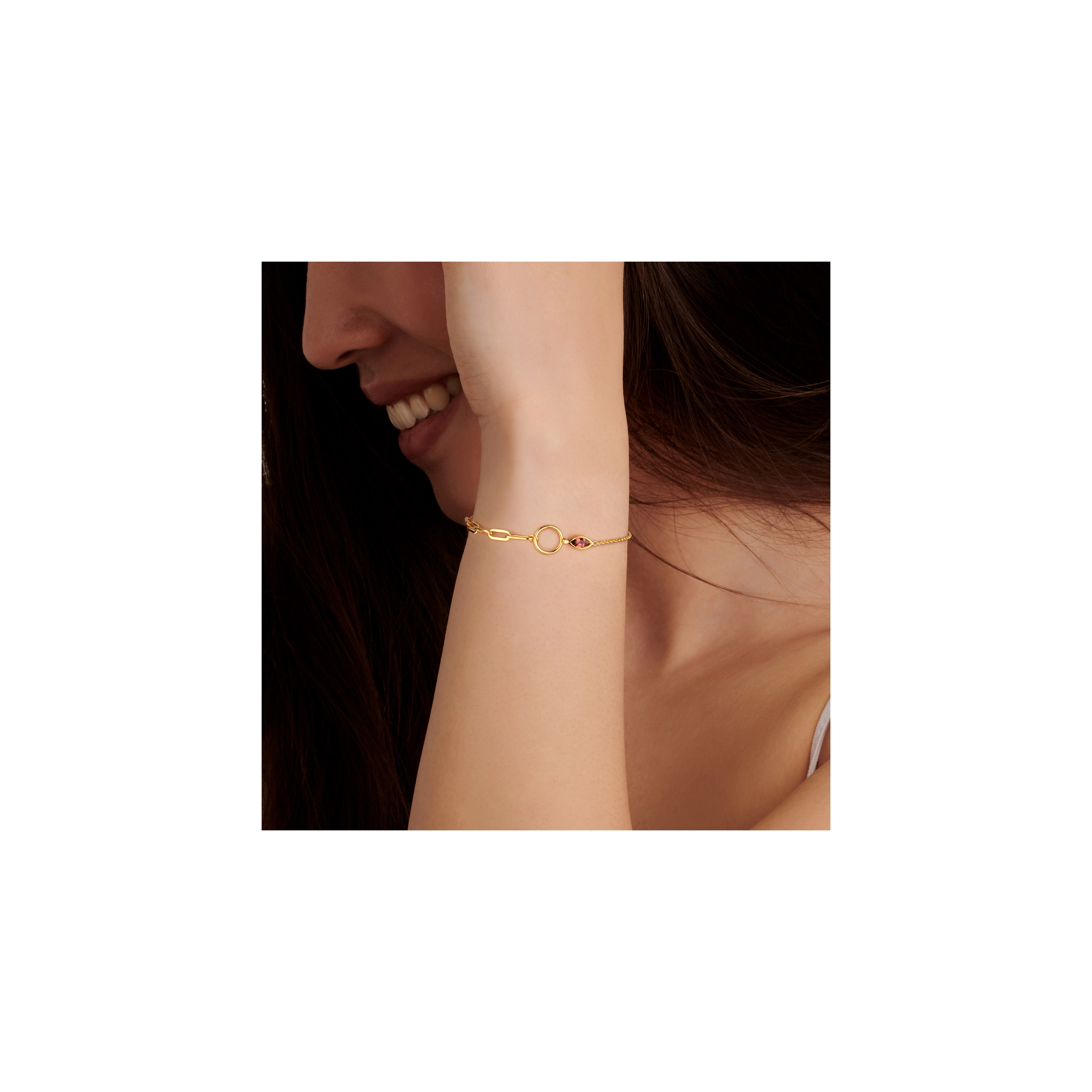 A delicate mix of chains and a deeply mysterious marquise cut Pyrope Garnet hitting center stage. Whispering like a soft breeze and calling out for a newfound sense of freedom and hope.Can’t get enough of the arm candy? Our Endless Diamond cuff and Small Full Circle Of life bracelet are our most treasured goto’s.