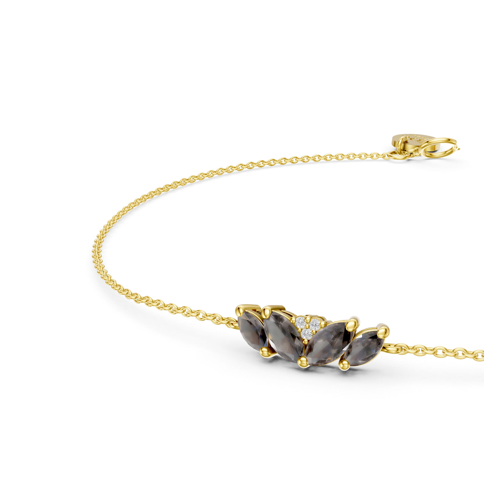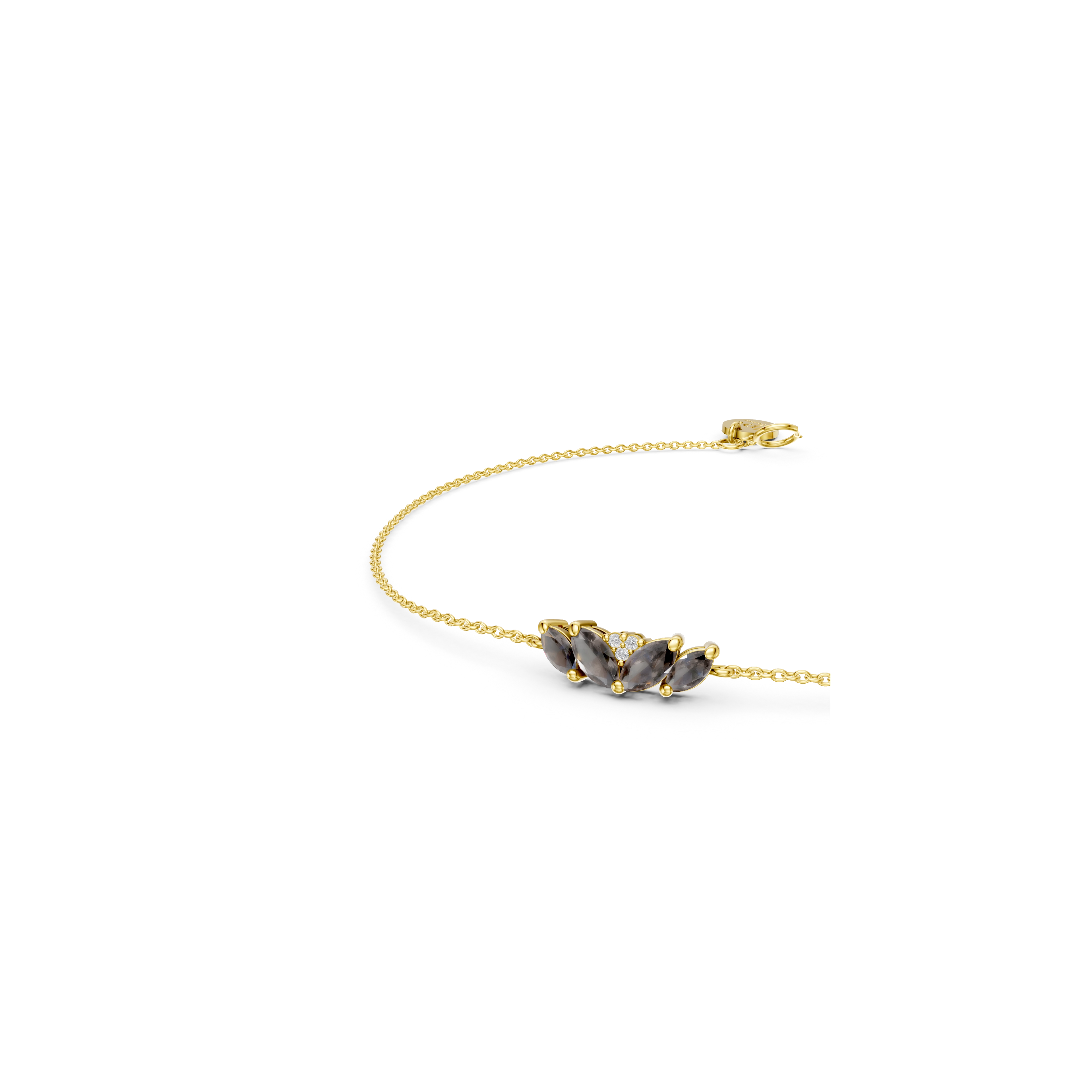 A graceful nod to the peacock’s flowing plumage, this bracelet features 4x marquise-cut smokey quartz gemstones set in a waved, fan-like formation. 3x natural diamonds glisten at the heart of the design, adding just the right amount of sparkle — bringing effortless elegance and a hint of intrigue to your style.