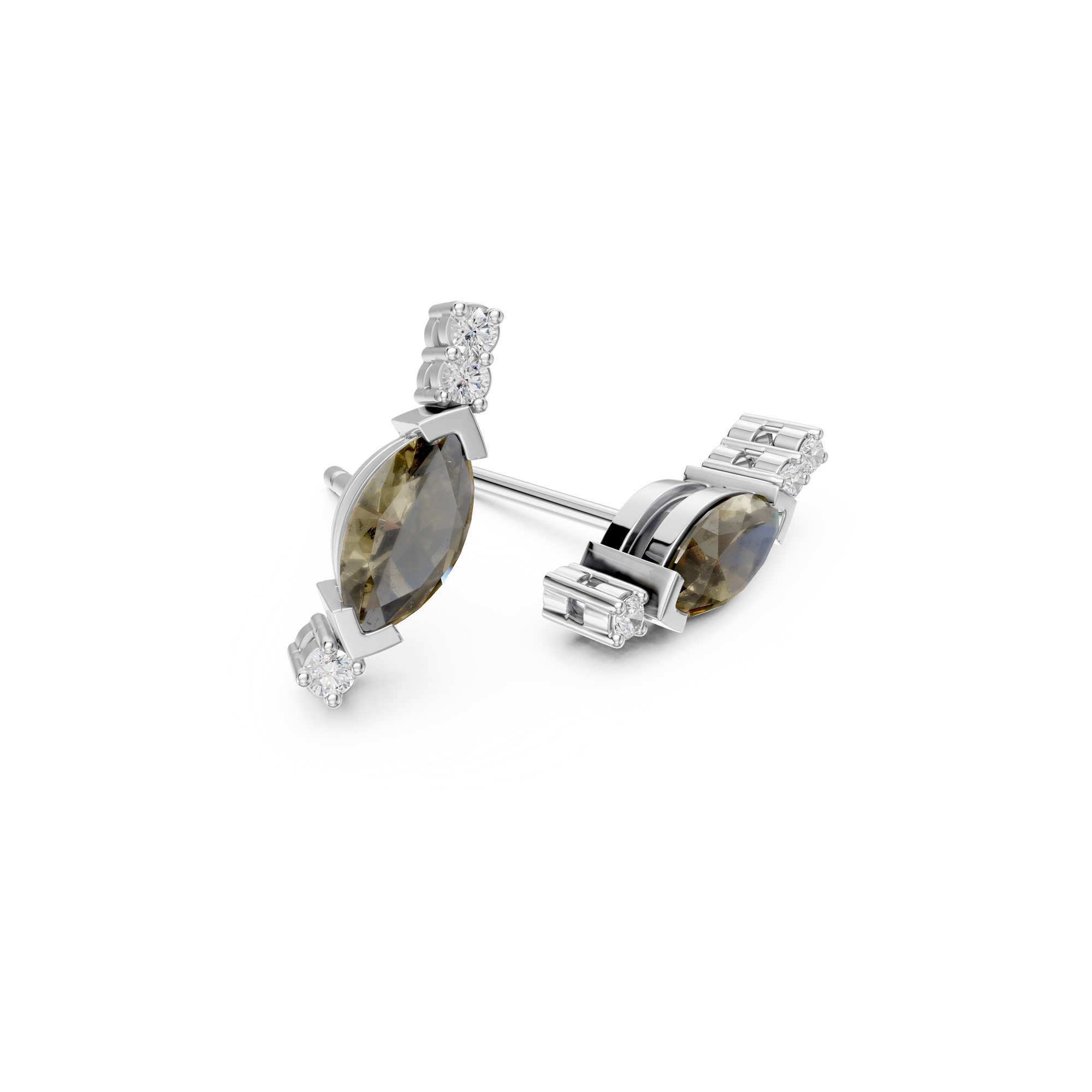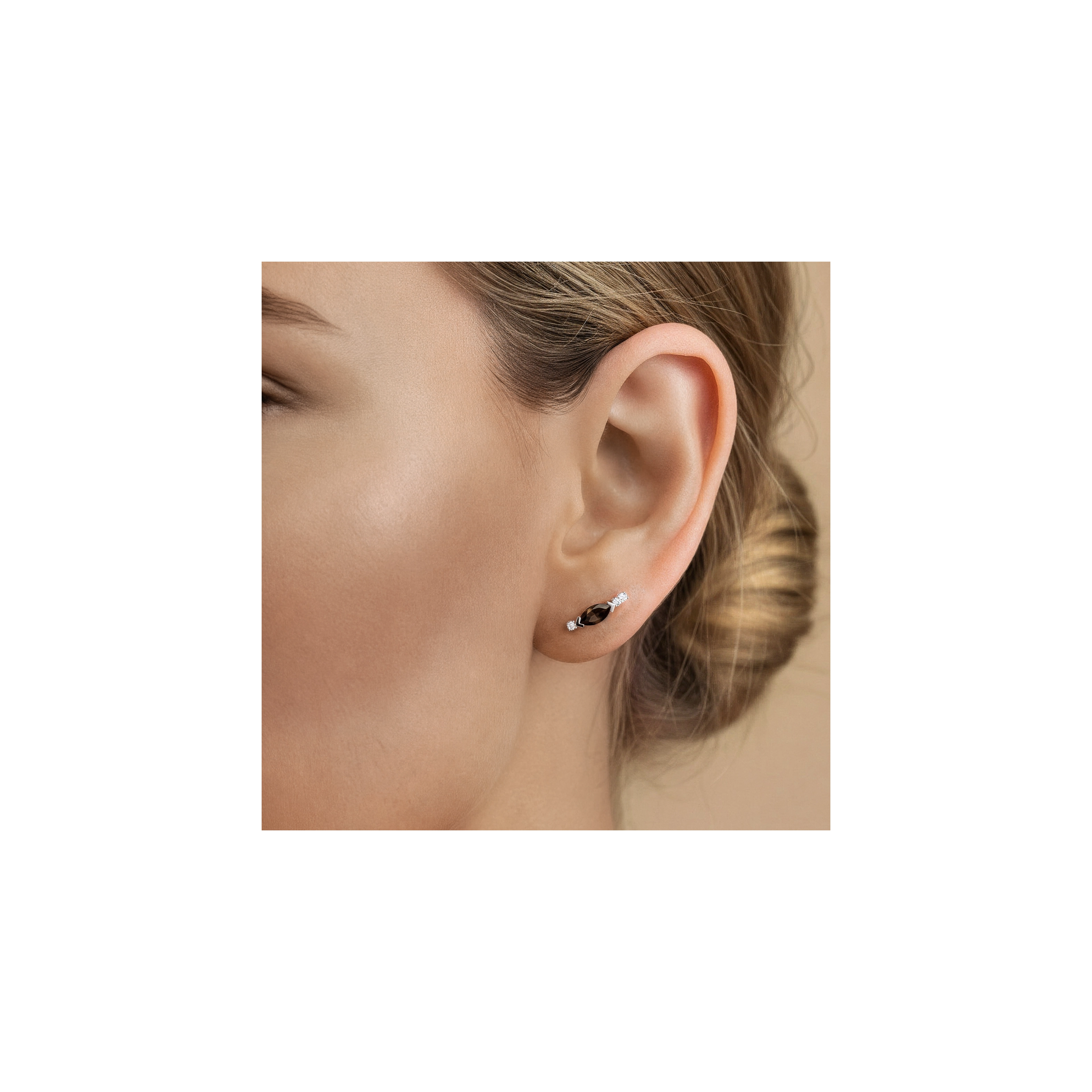 A playful wink to asymmetry, these stud earrings feature marquise-cut smokey quartz hugged by sparkling diamonds — two on one side, one on the other — for a look that’s effortlessly chic. Inspired by the hypnotic eyes of a peacock’s plume, they bring subtle drama to your ear stack. Wear them solo or mix them with the Mira pendants for a modern twist on classic elegance and a whisper of decadence.