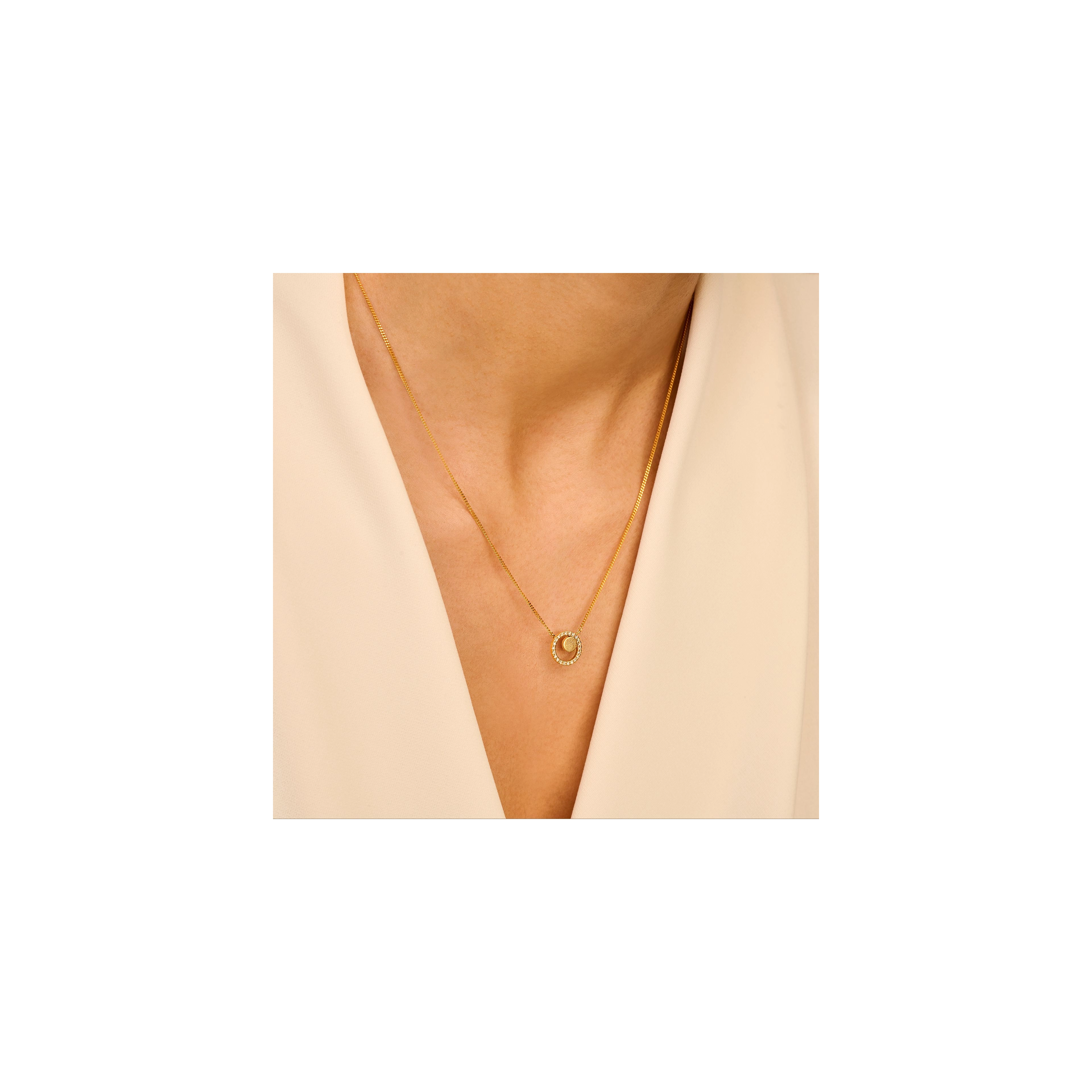 A diamond pave sphere of 22x natural diamonds, graced by a delicately brushed disc — the perfect pendant necklace for those who belong amongst the brightest stars.STYLING TIP Effortlessly stylish with anything from our Venus, Mars and Jupiter series. Play around with sizes and layers for an out of this world brilliance.