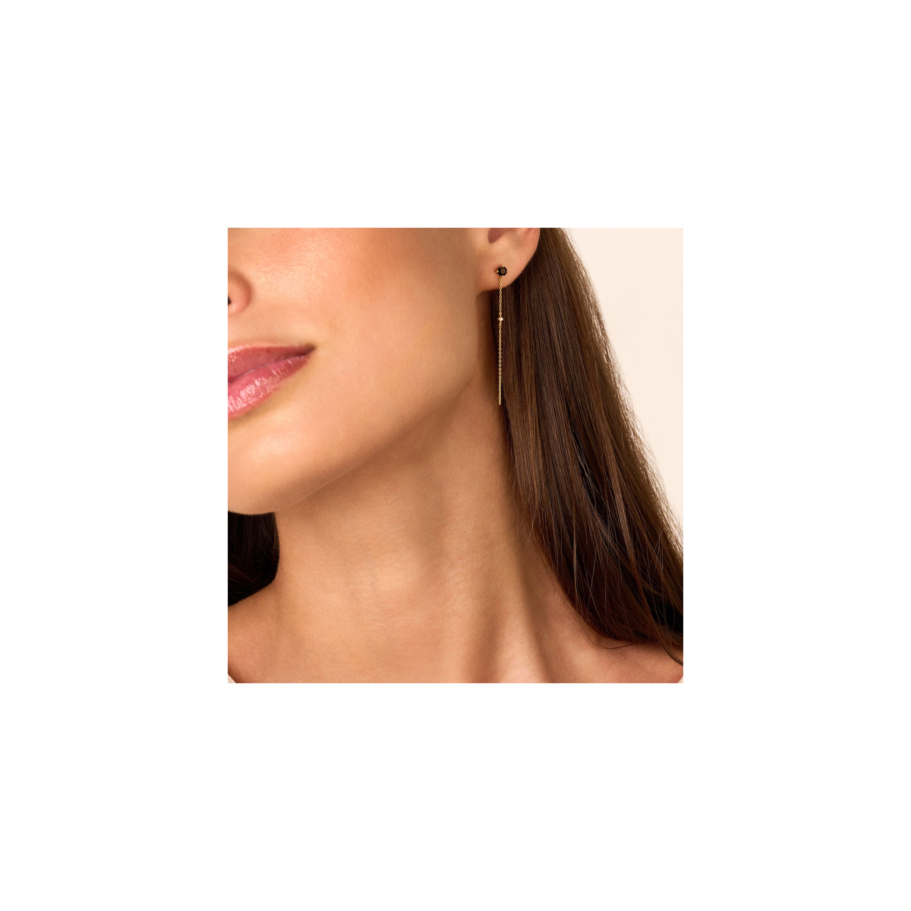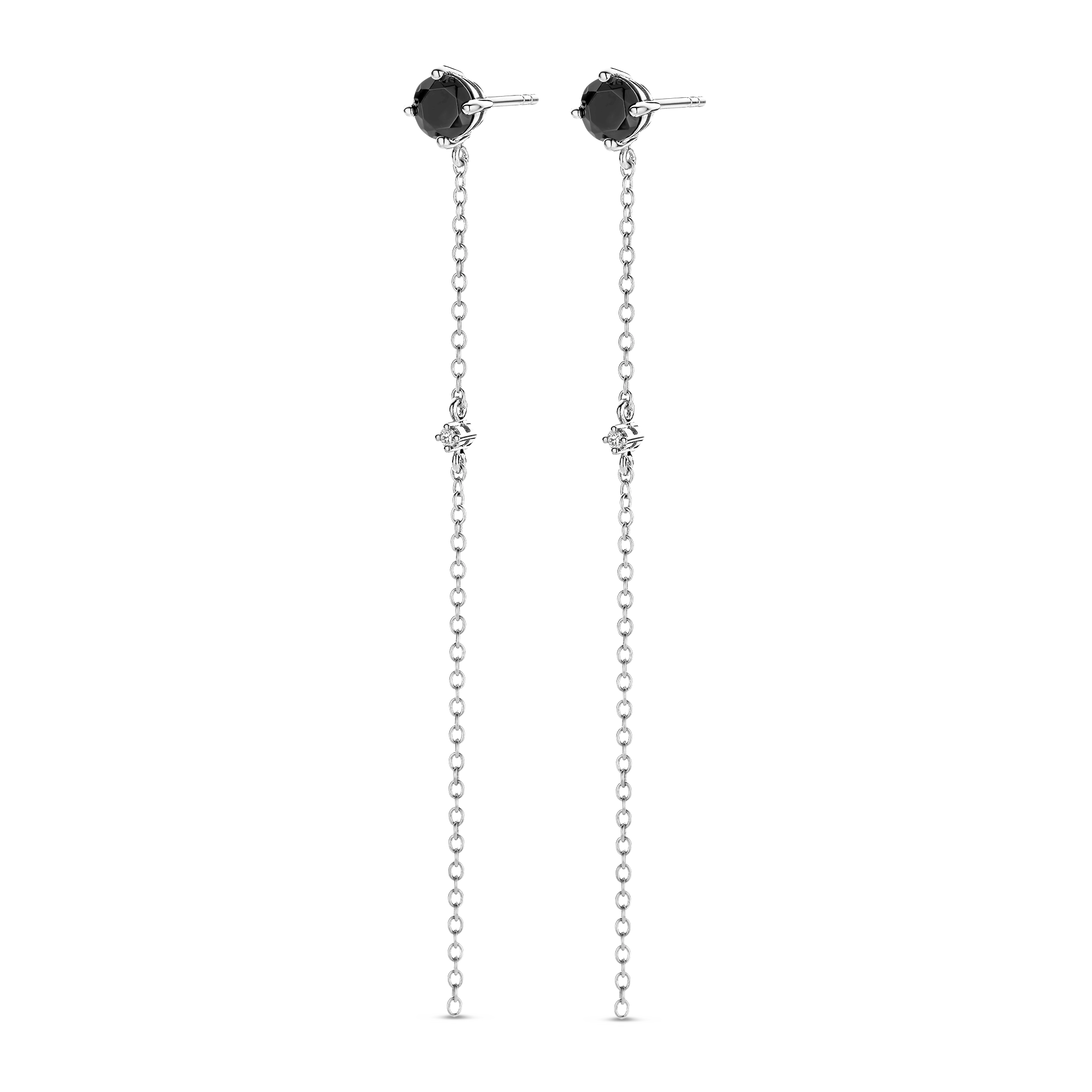 Embracing the mysterious darkness of black onyx gemstones, these round studs are embellished with natural diamonds (2x) fl oating on a sleek chain. It’s your little black dress, jewelry-style.