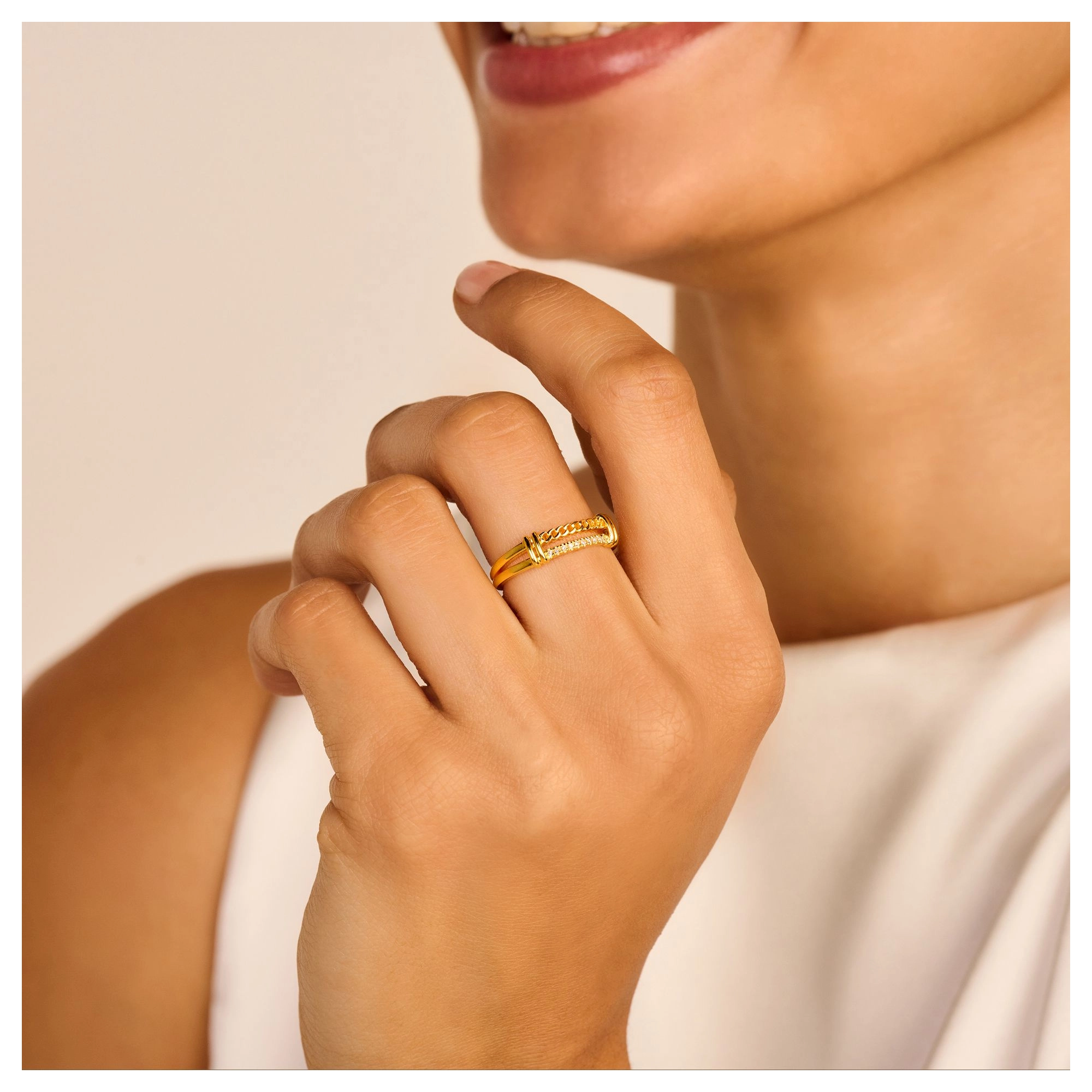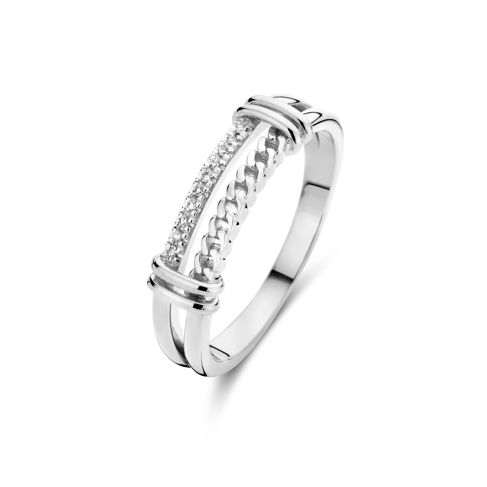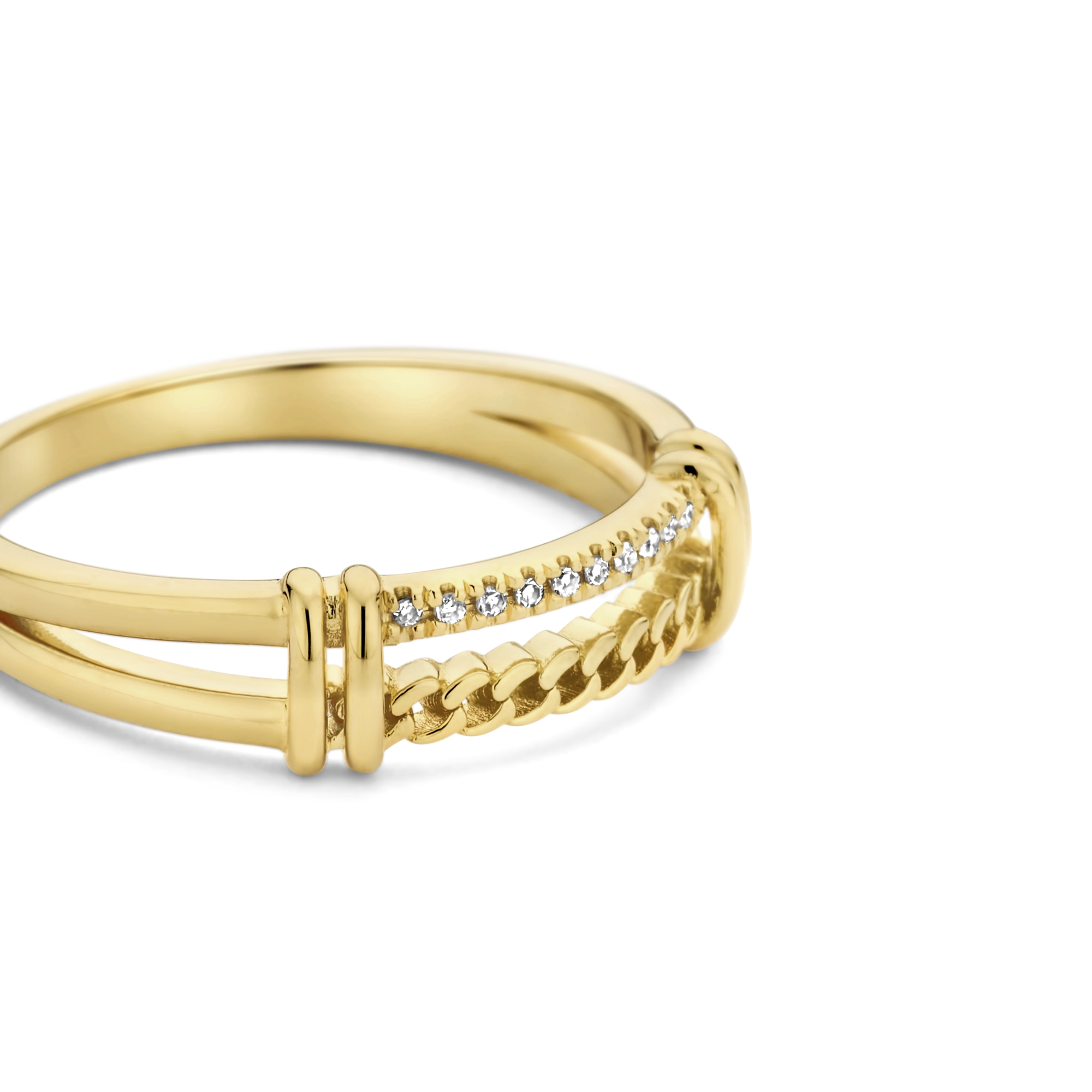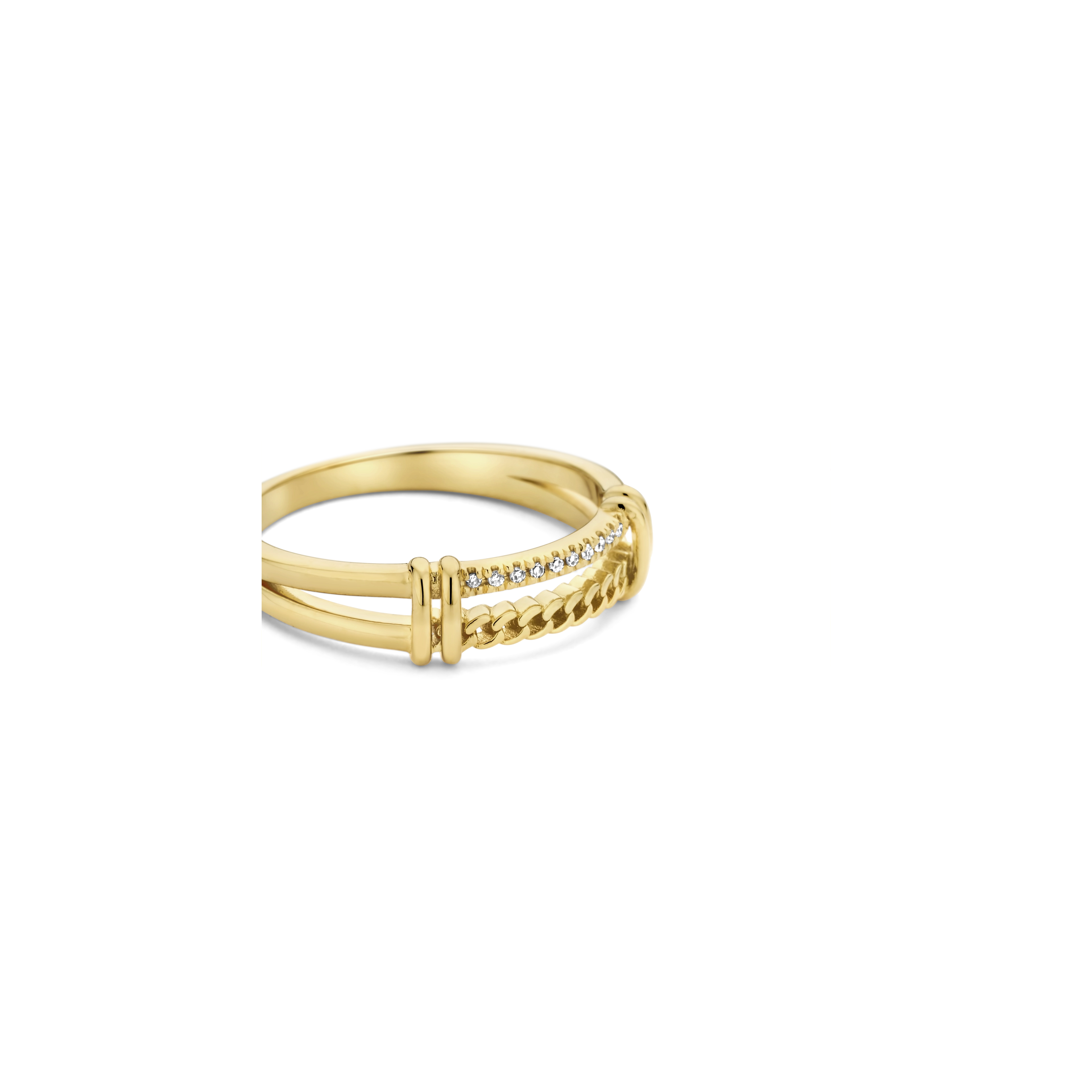 A double intertwined ring – a flowing curb chain rope blends in wonderfully with a diamond shank, highlighting 10x dazzling natural diamonds. It’s a centerpiece ring for you deserve to be the leading character of your own life.