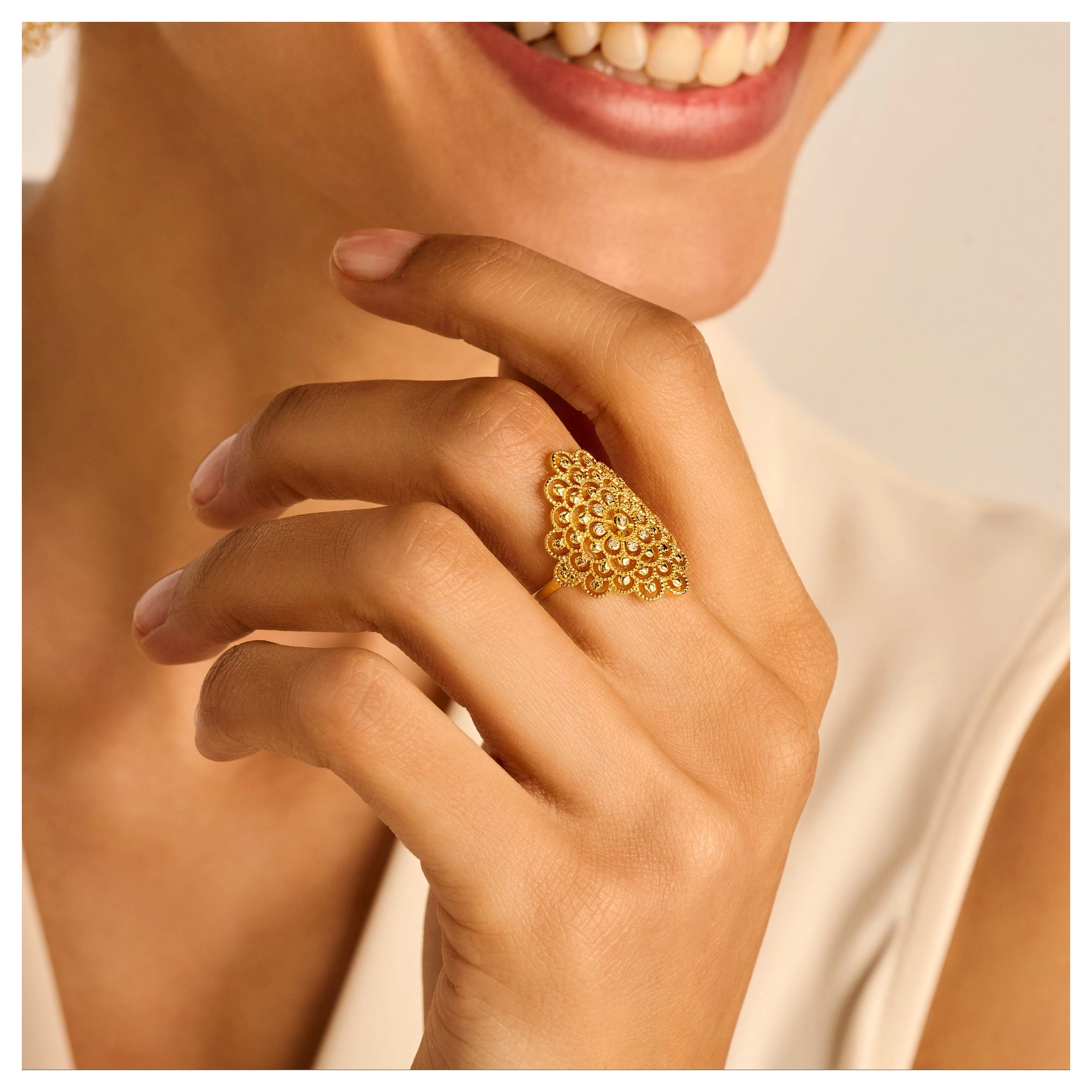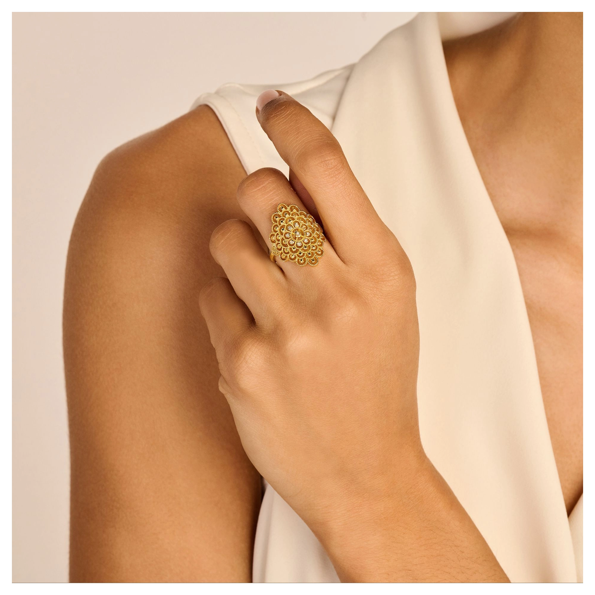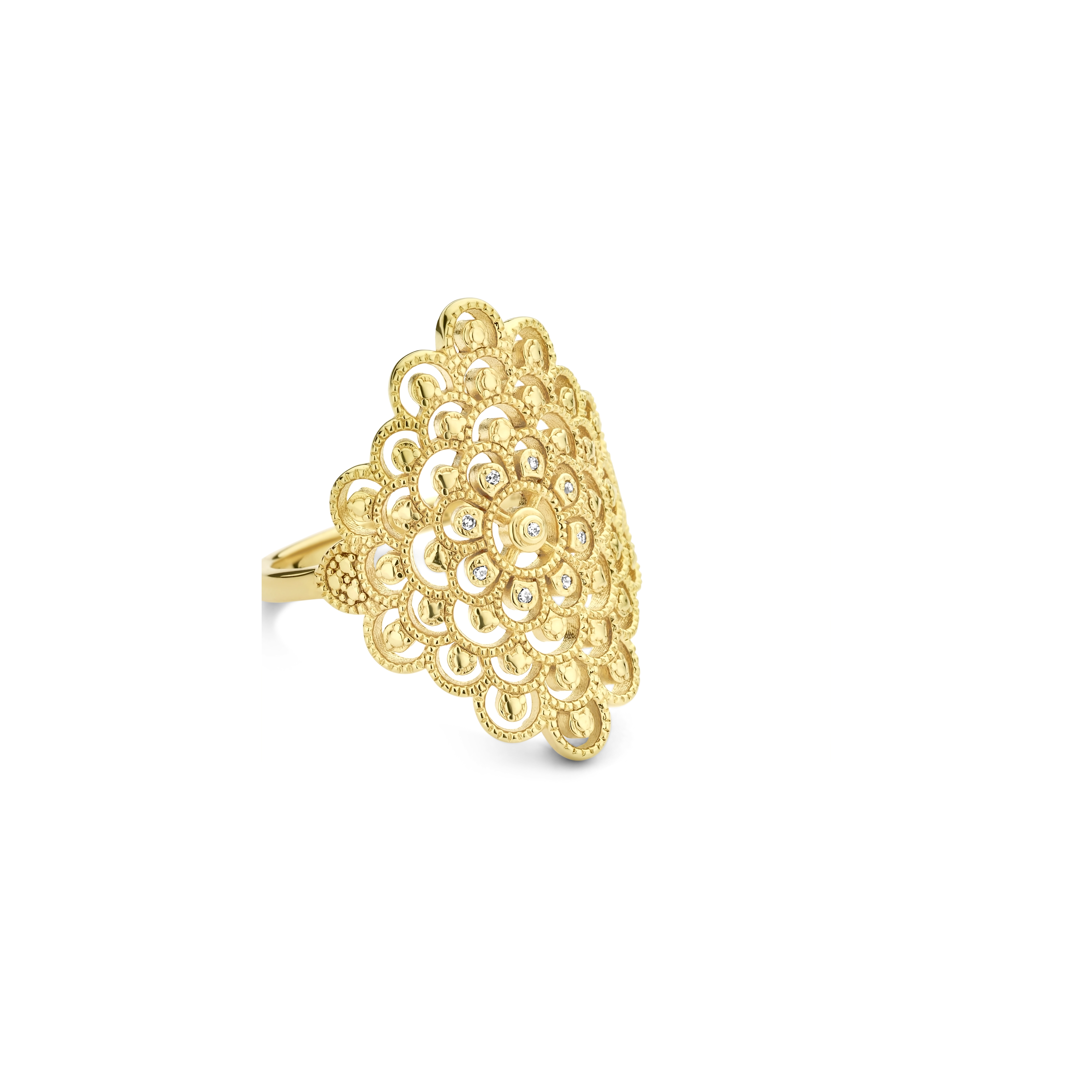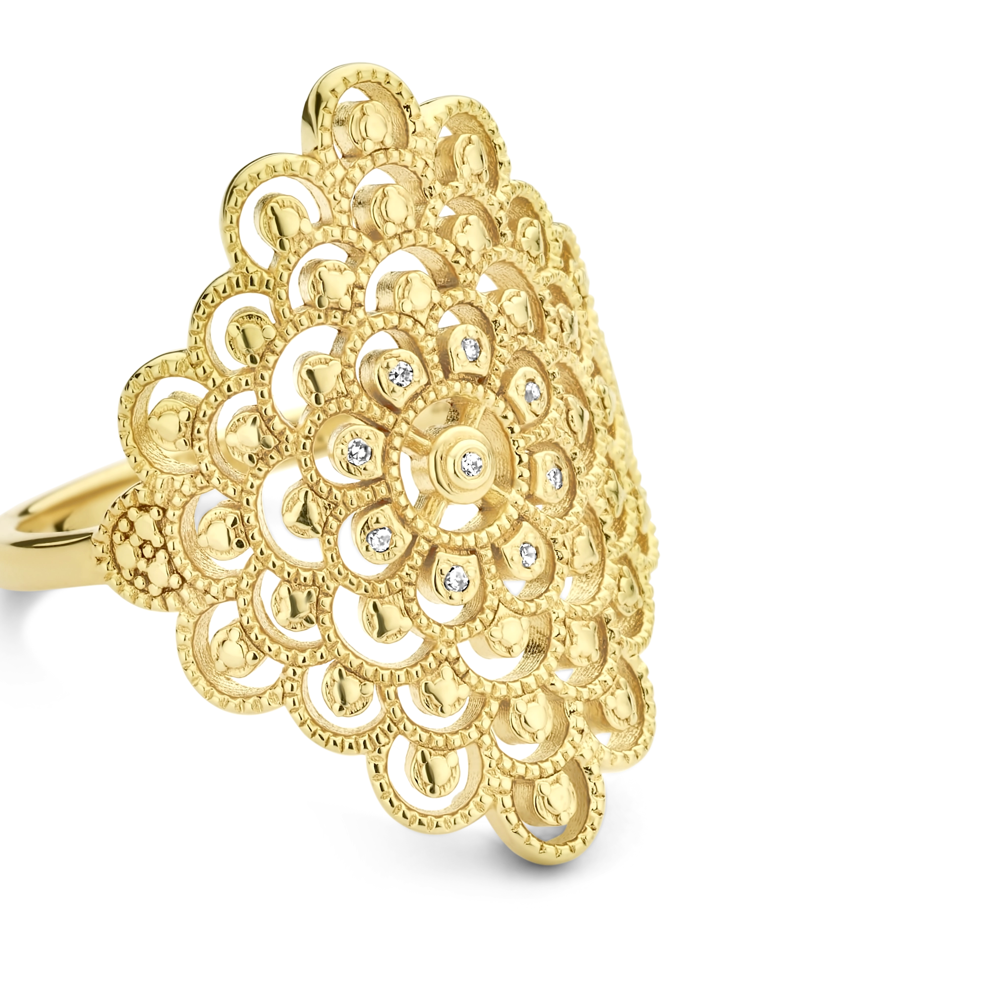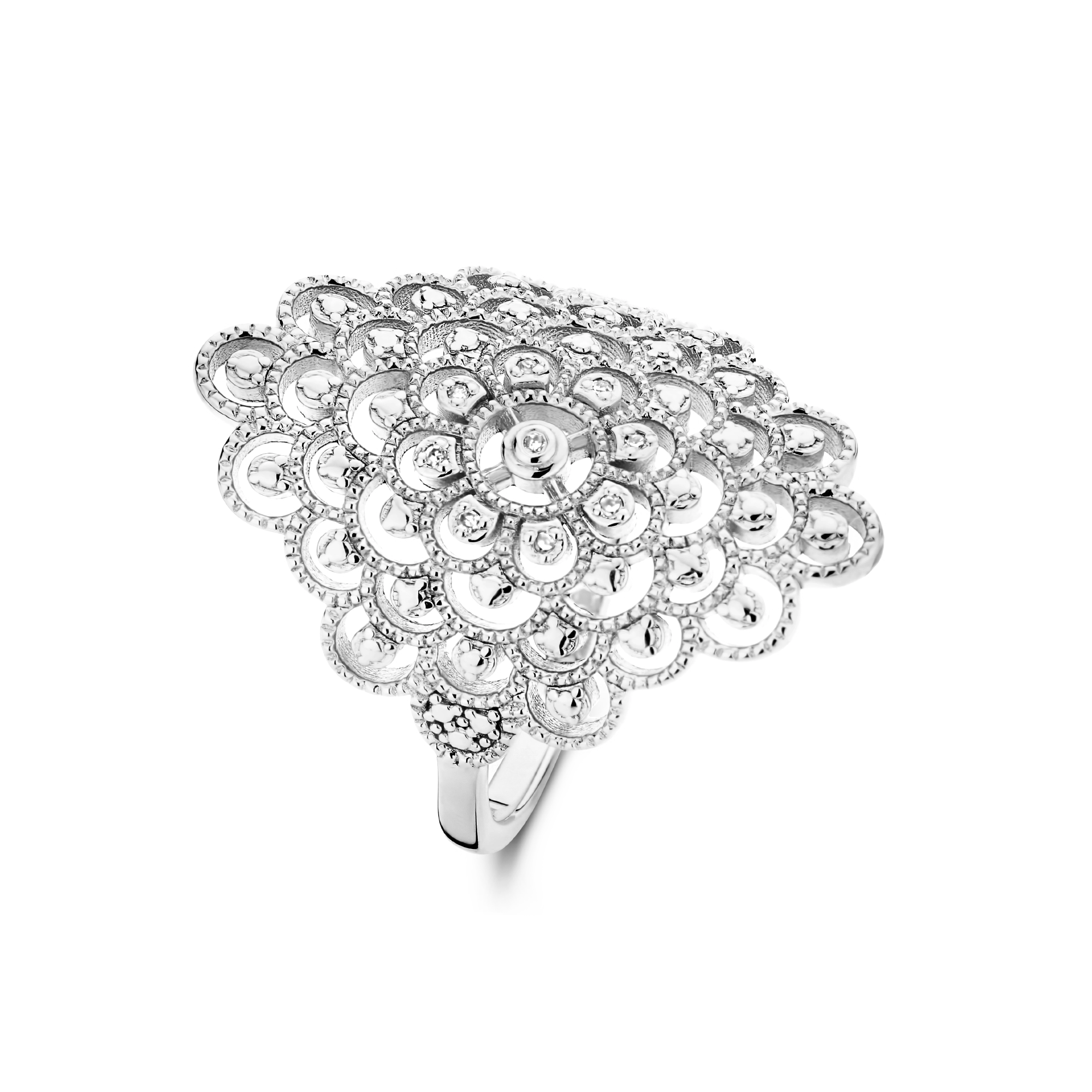 A bold, yet detailed pattern, crafted with the utmost care and handset with 10x natural diamonds at its heart. It is safe to say that nothing beats the shimmer from this statement ring, except for yours that is.