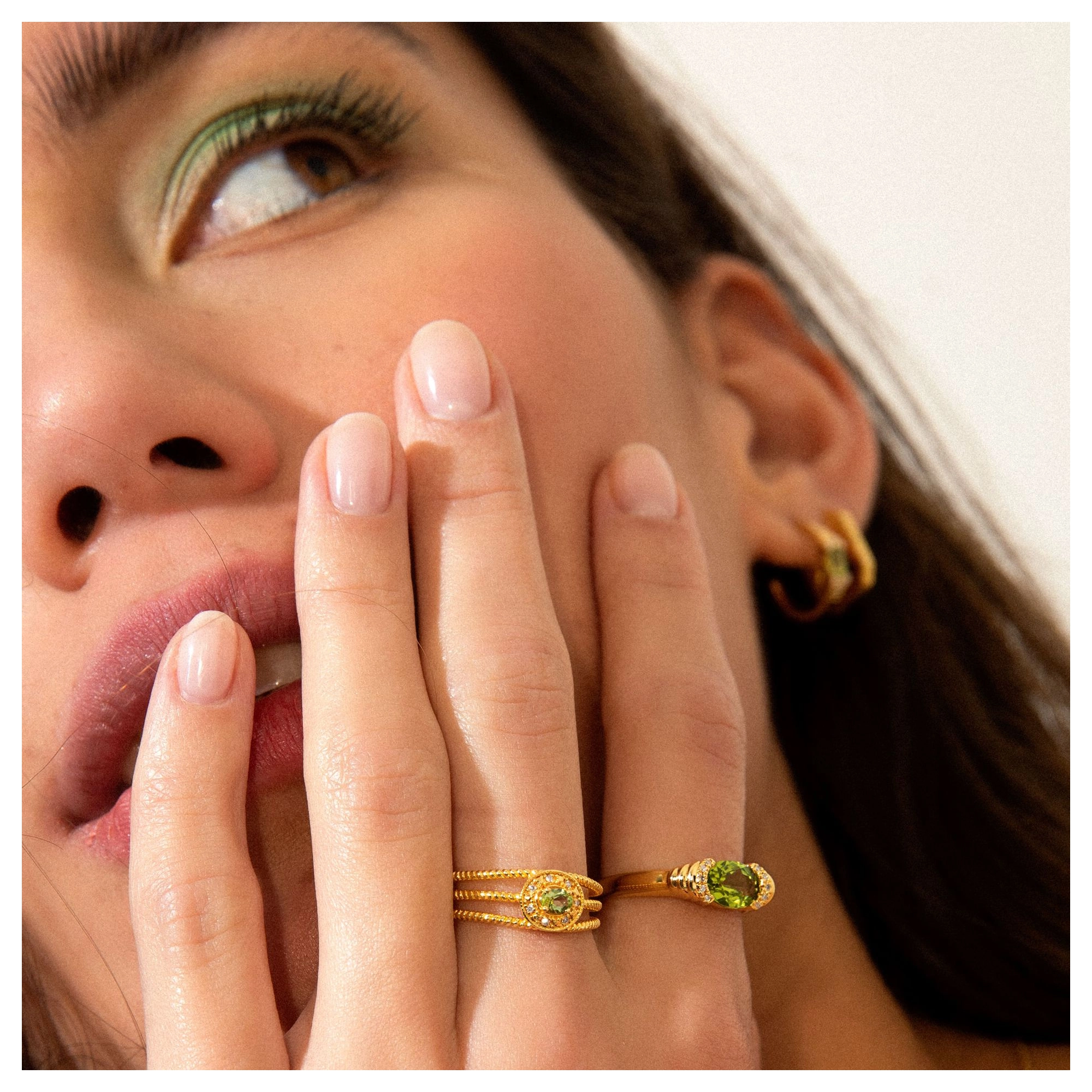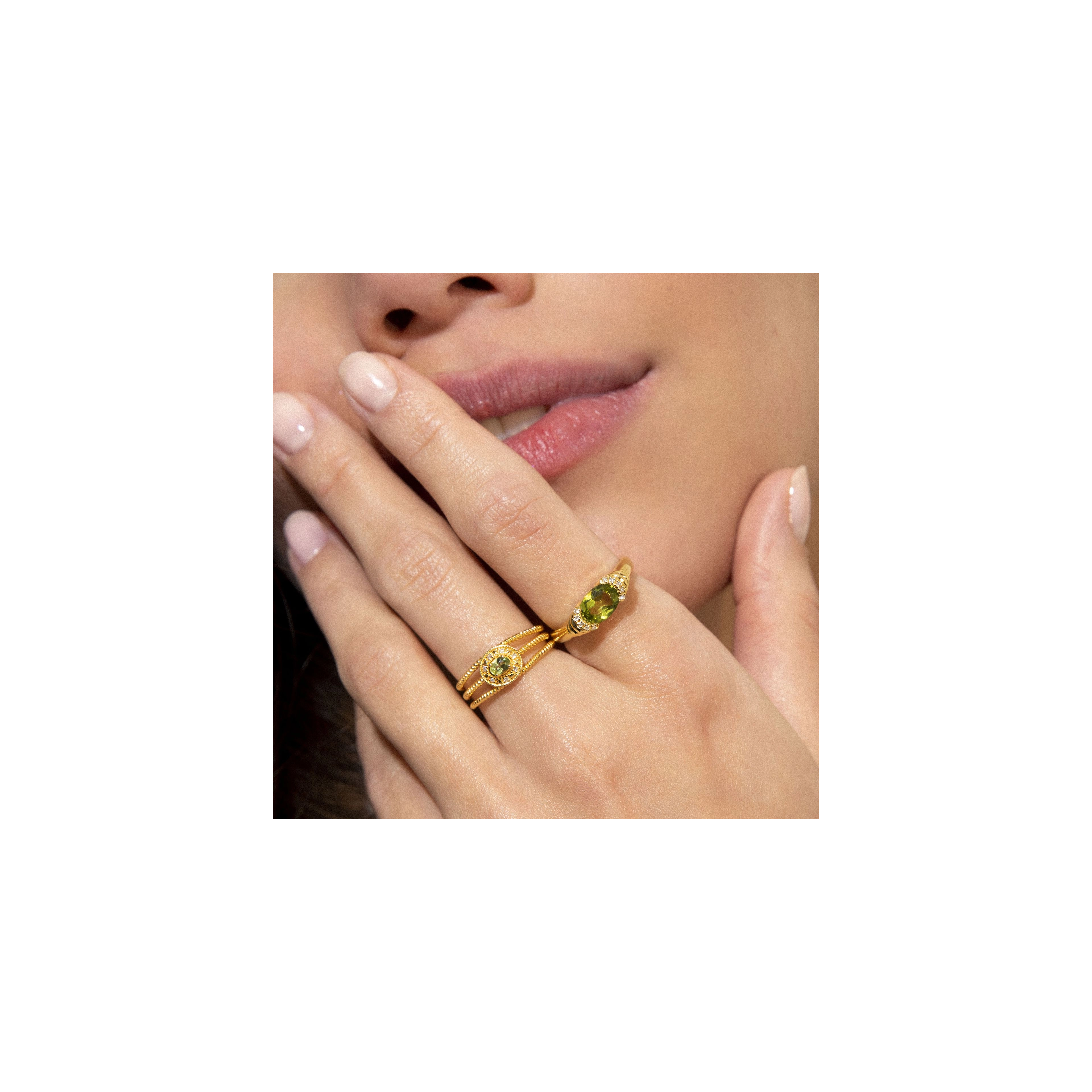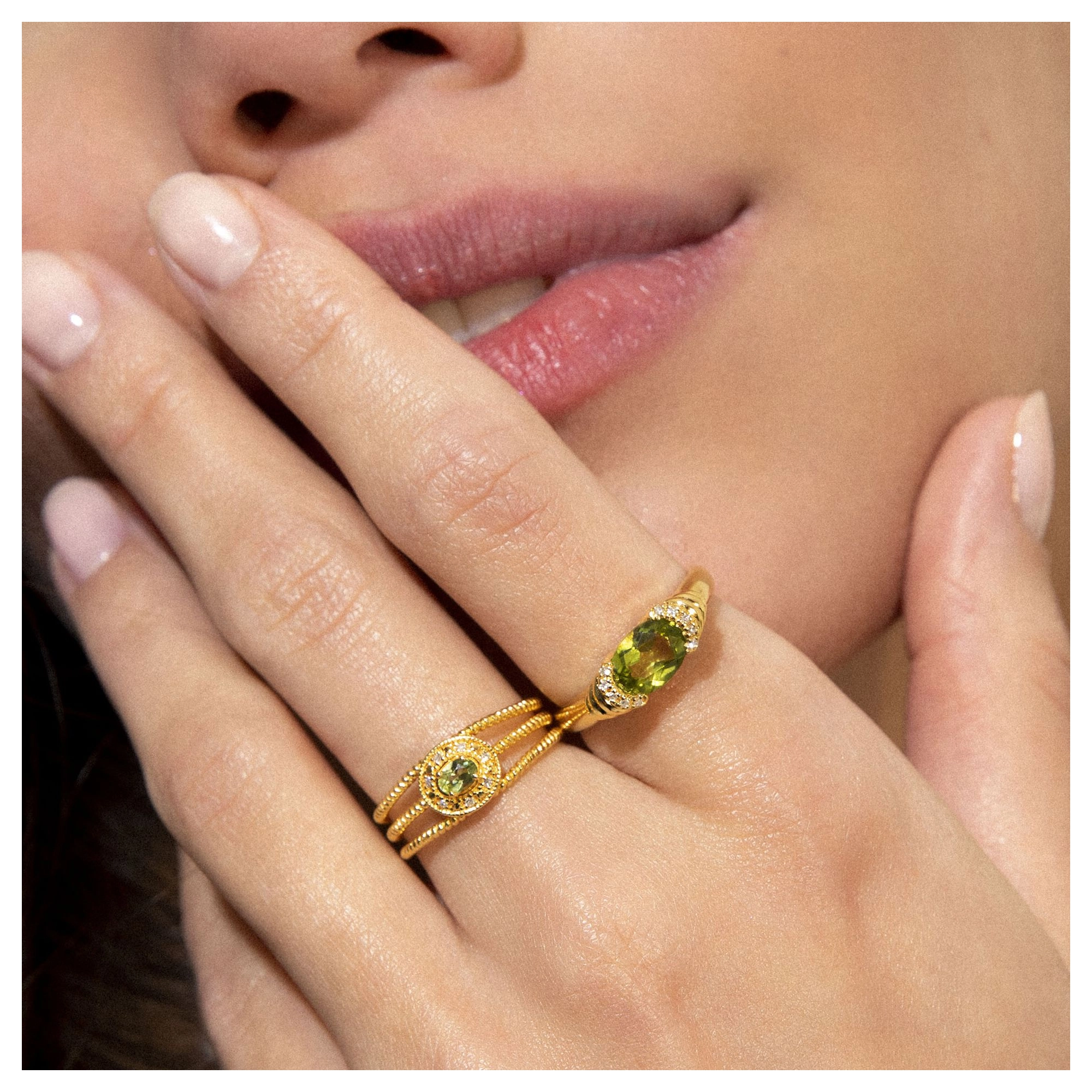 The soft shade of green and layered levels, we love to see in lush greenery landscapes and pistachio gelato. This statement ring with aperidot centre stone and 10x hugging diamonds, is without a doubt our biggest summer crush ever. Styling tip: Go all out Sophia-Loren-style by pairing our Gelato and Dolce Mare ring.