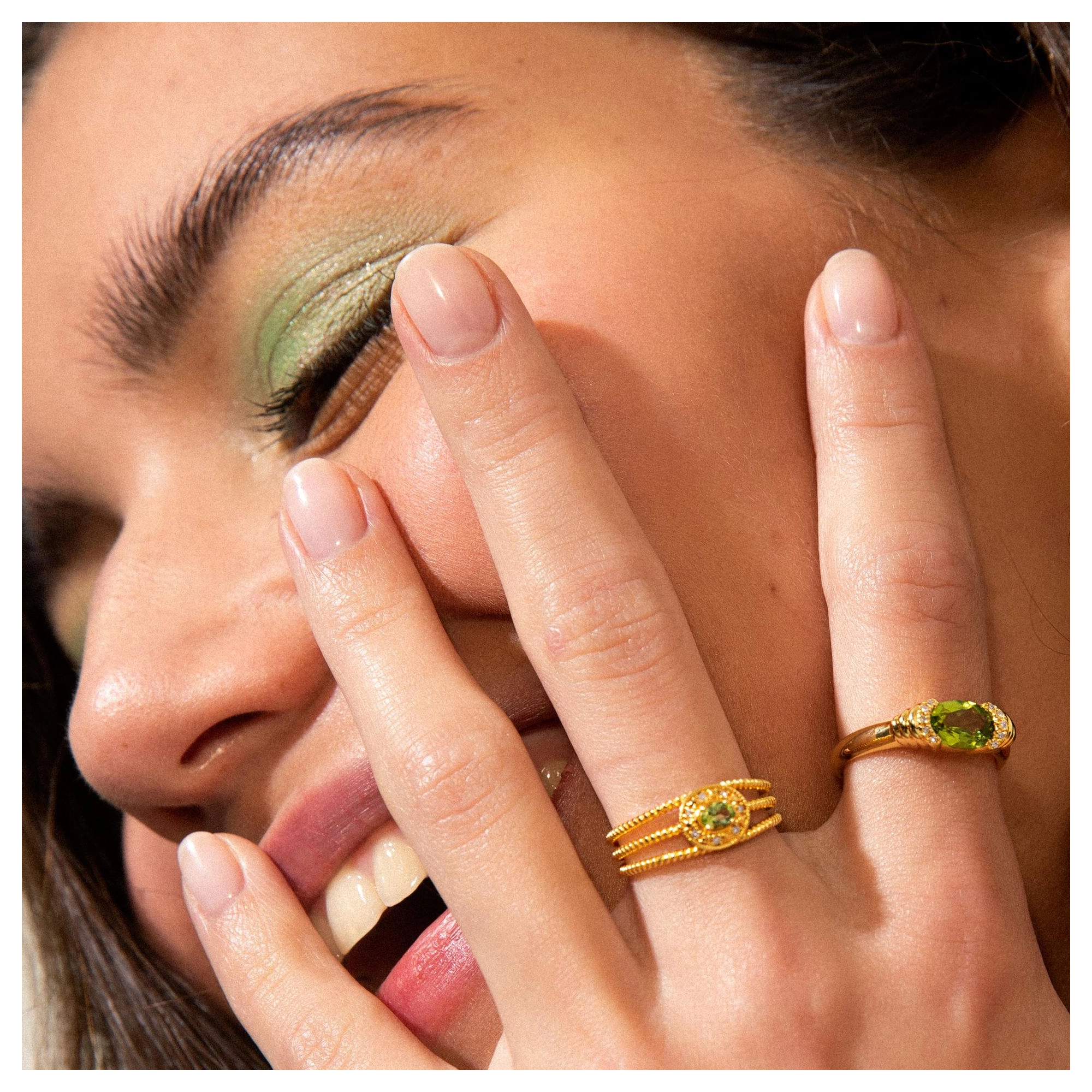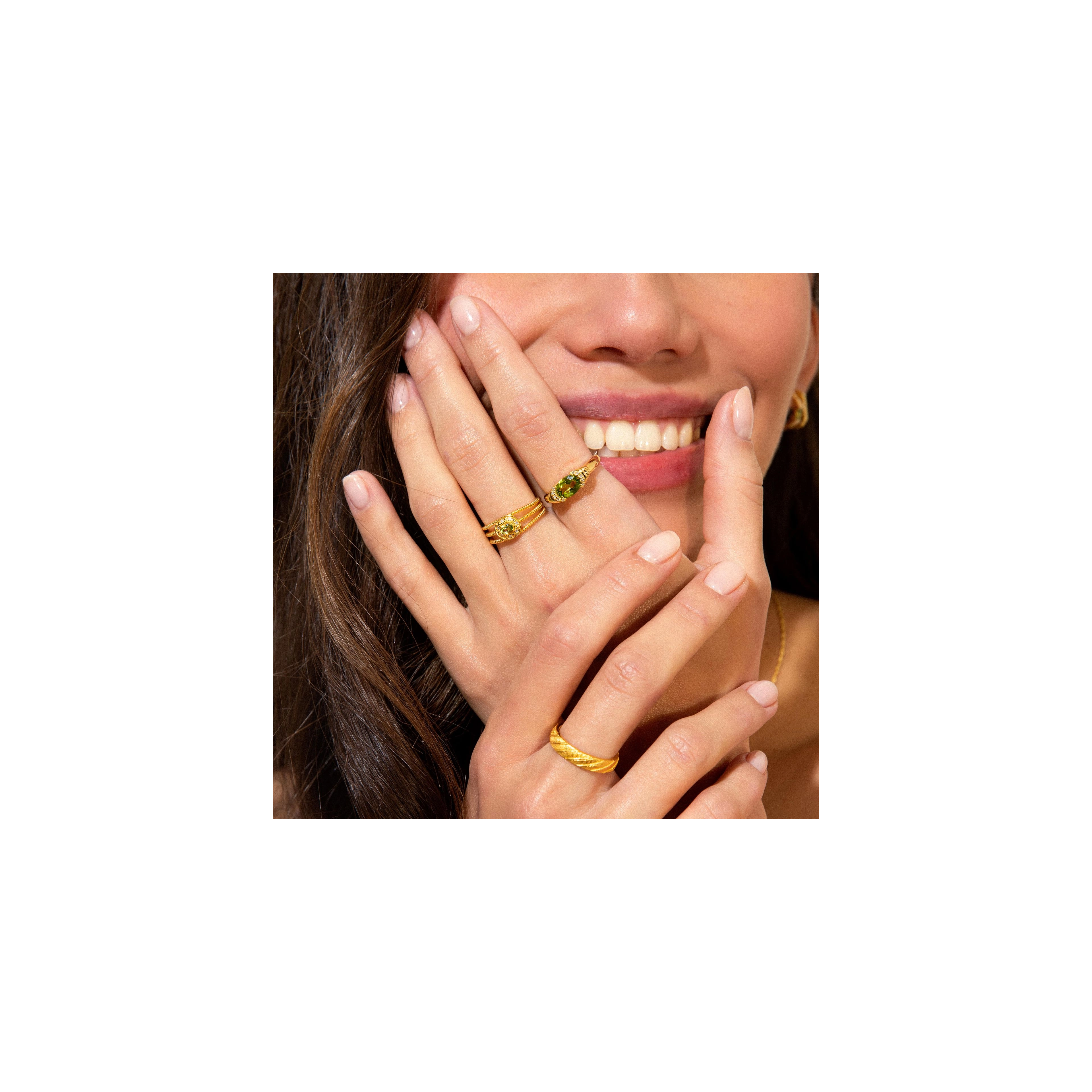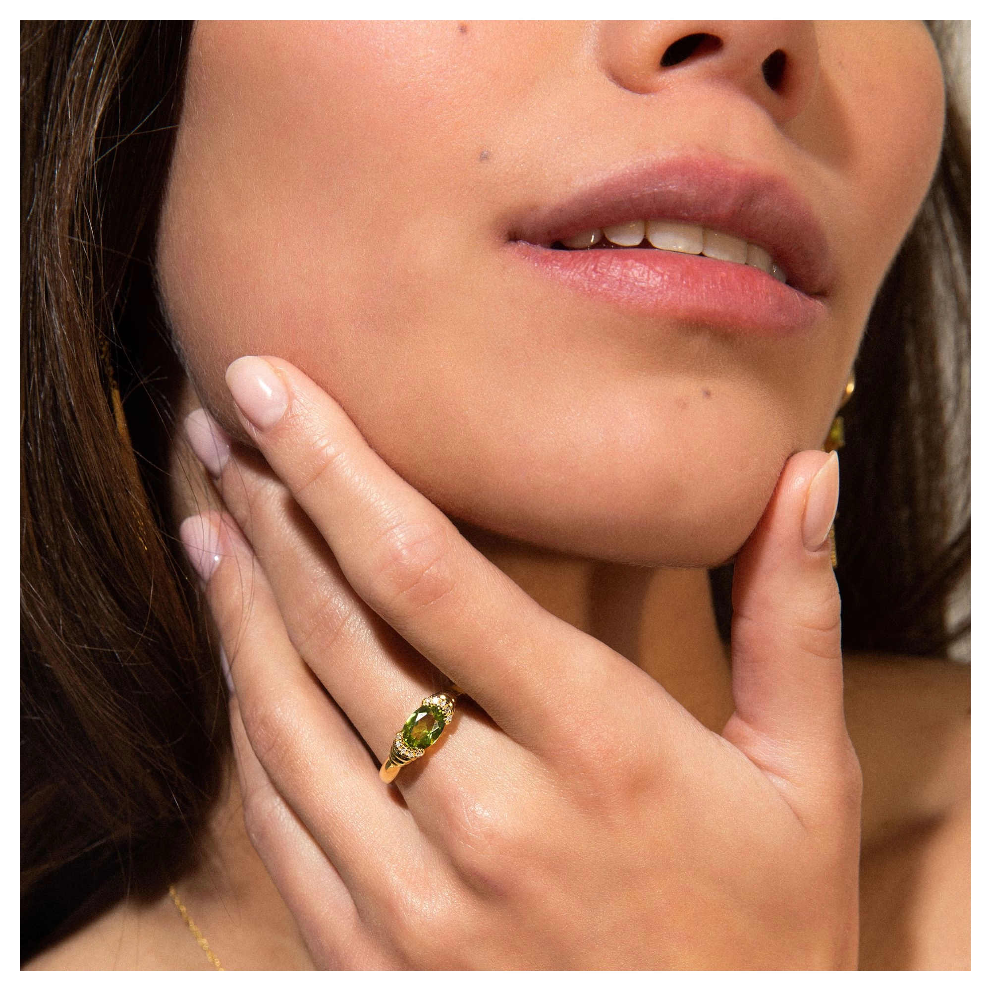 The soft shade of green and layered levels, we love to see in lush greenery landscapes and pistachio gelato. This statement ring with aperidot centre stone and 10x hugging diamonds, is without a doubt our biggest summer crush ever. Styling tip: Go all out Sophia-Loren-style by pairing our Gelato and Dolce Mare ring.