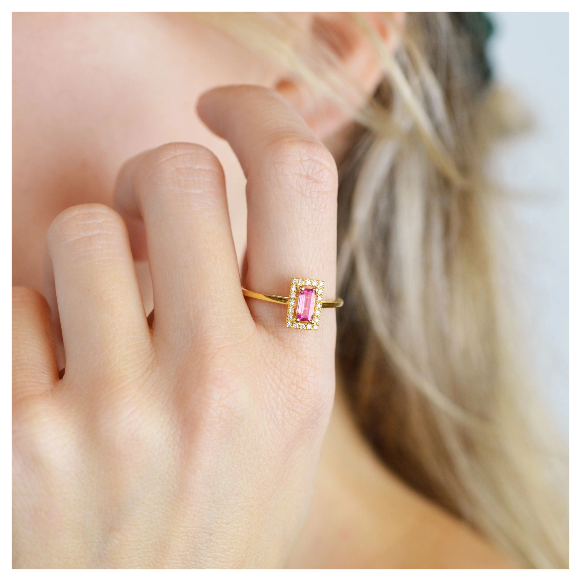 A striking pink Tourmaline adds a soft touch to this bold and ravishing 14 carat gold design. Defining pure beauty as 20x white diamonds catch the playful light of day.
