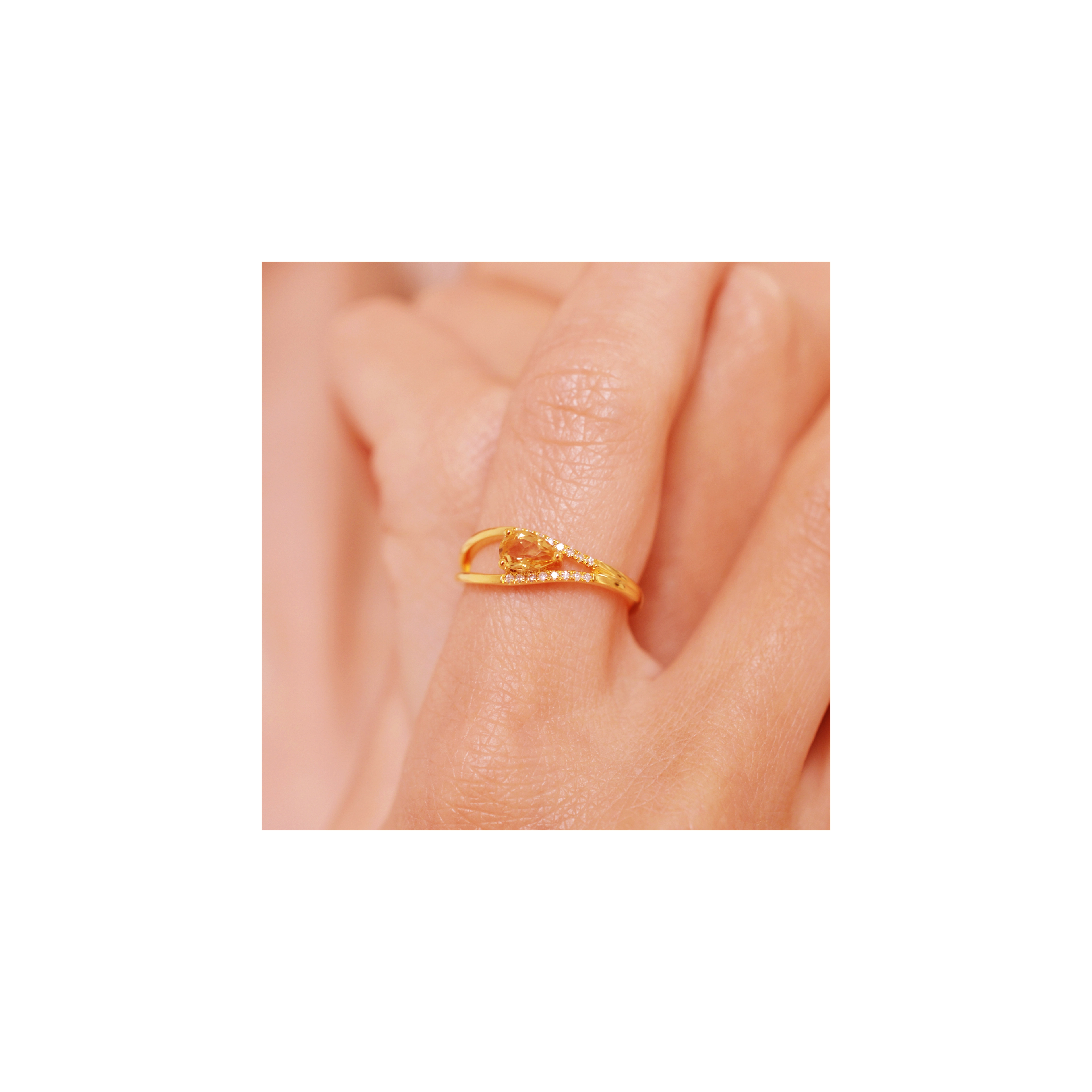 A striking pear-shaped ochreous Citrine at the heart of our Marigold ring, surrounded by 16x white diamonds, sparkling like sunlit petals.