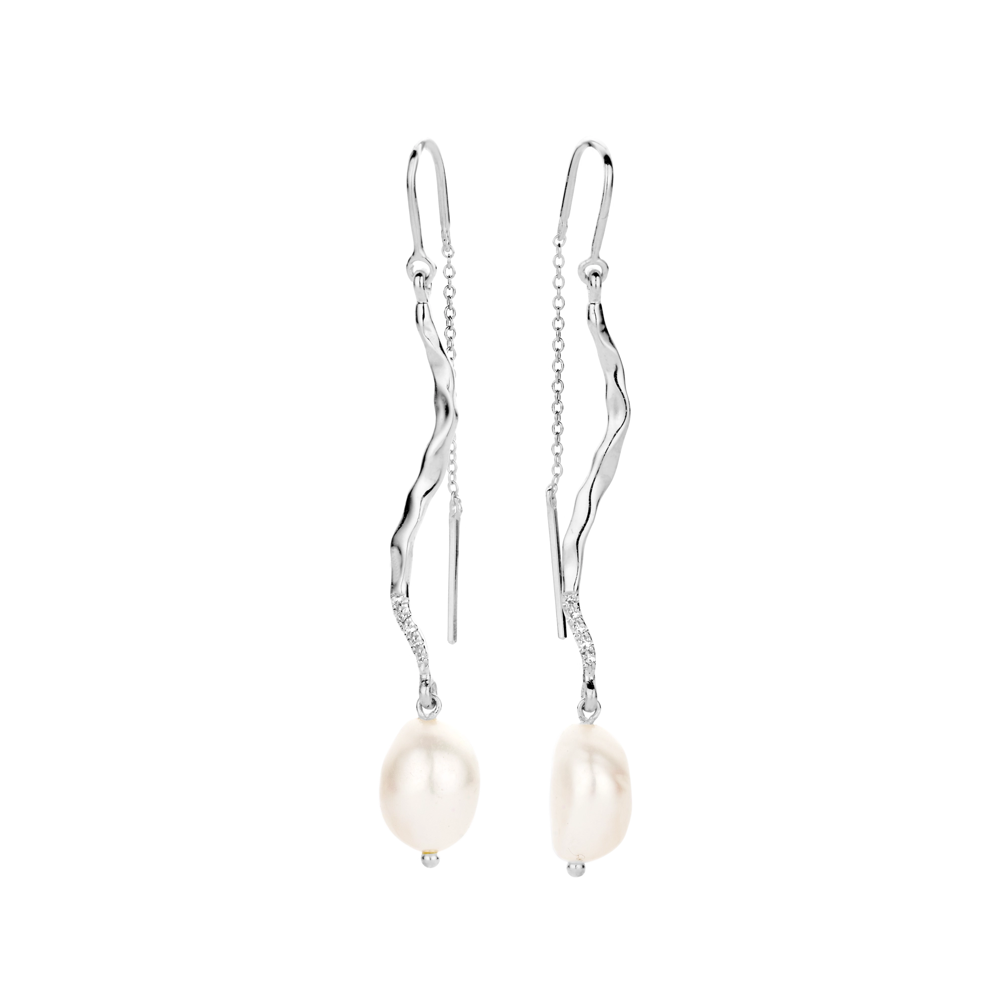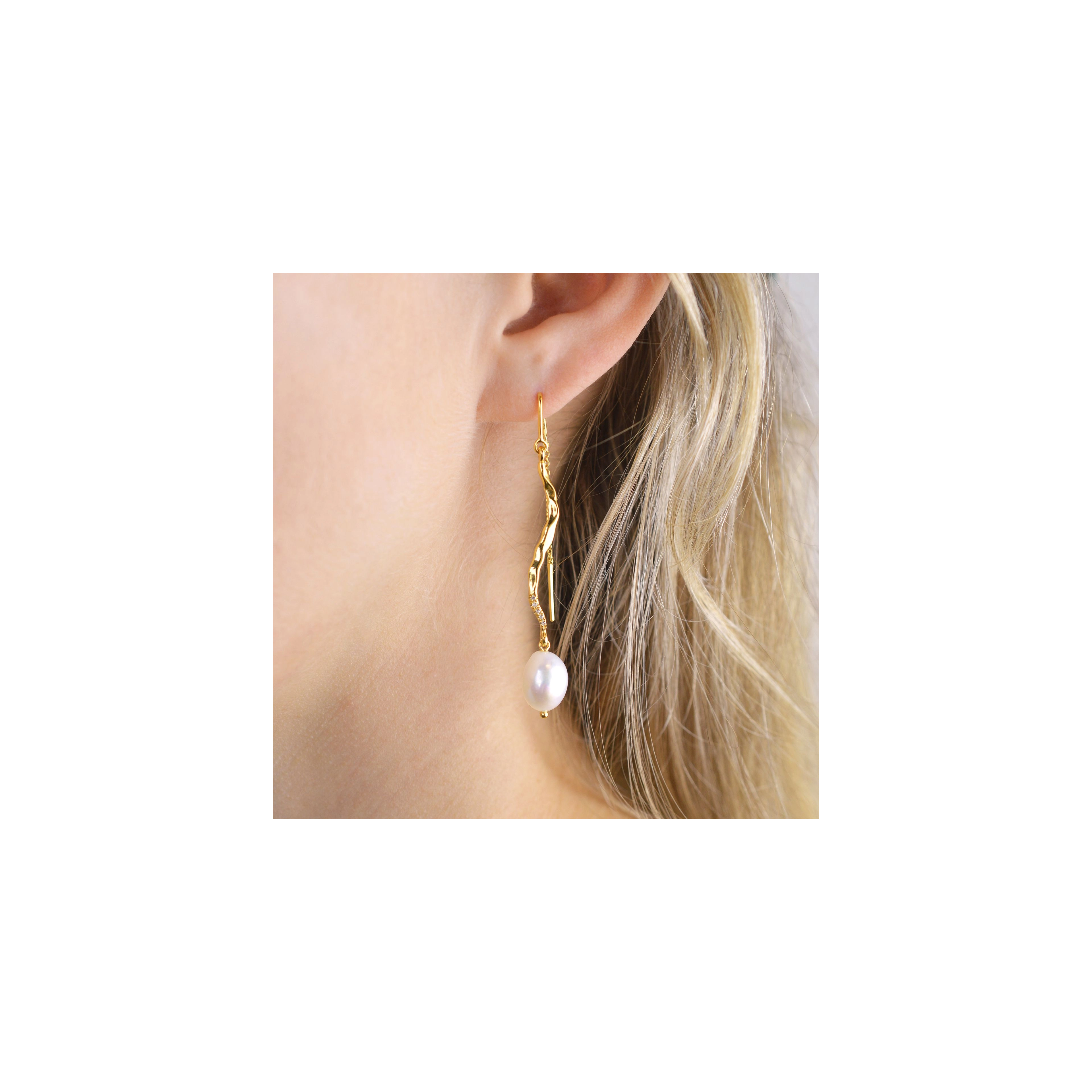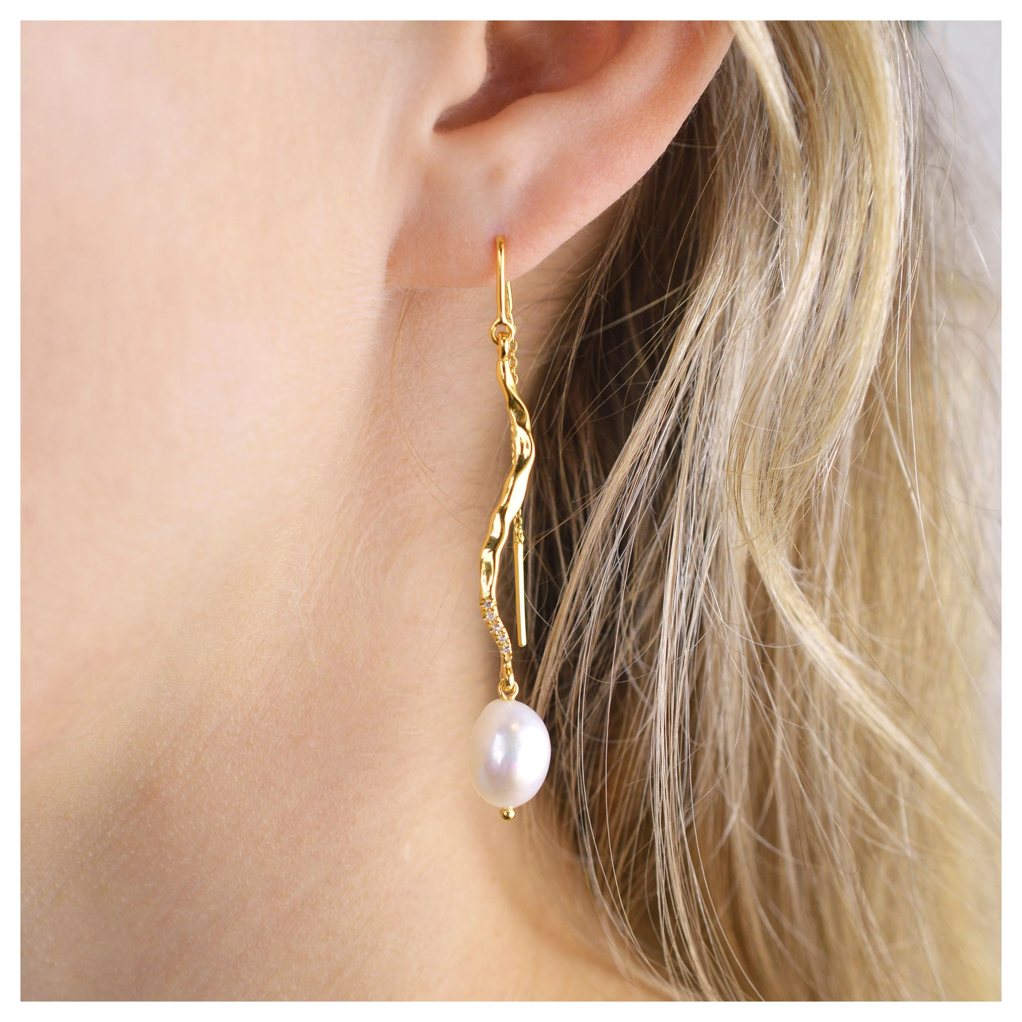 Inspired by Marilyn Monroe, goddess of the silver screen. Sensually flowing earrings featuring 10x diamonds and a baroque pearl, white as her signature platinum blonde locks.