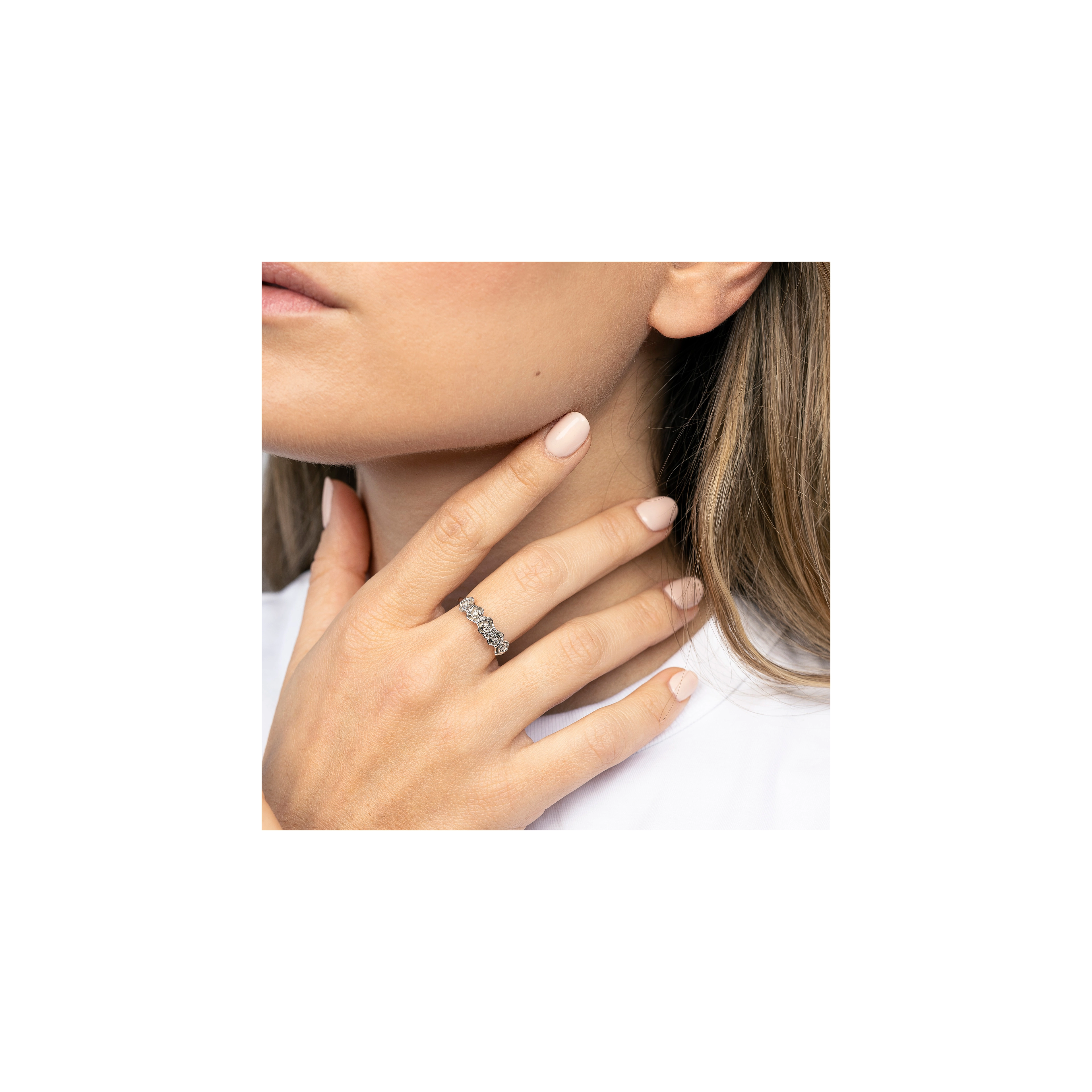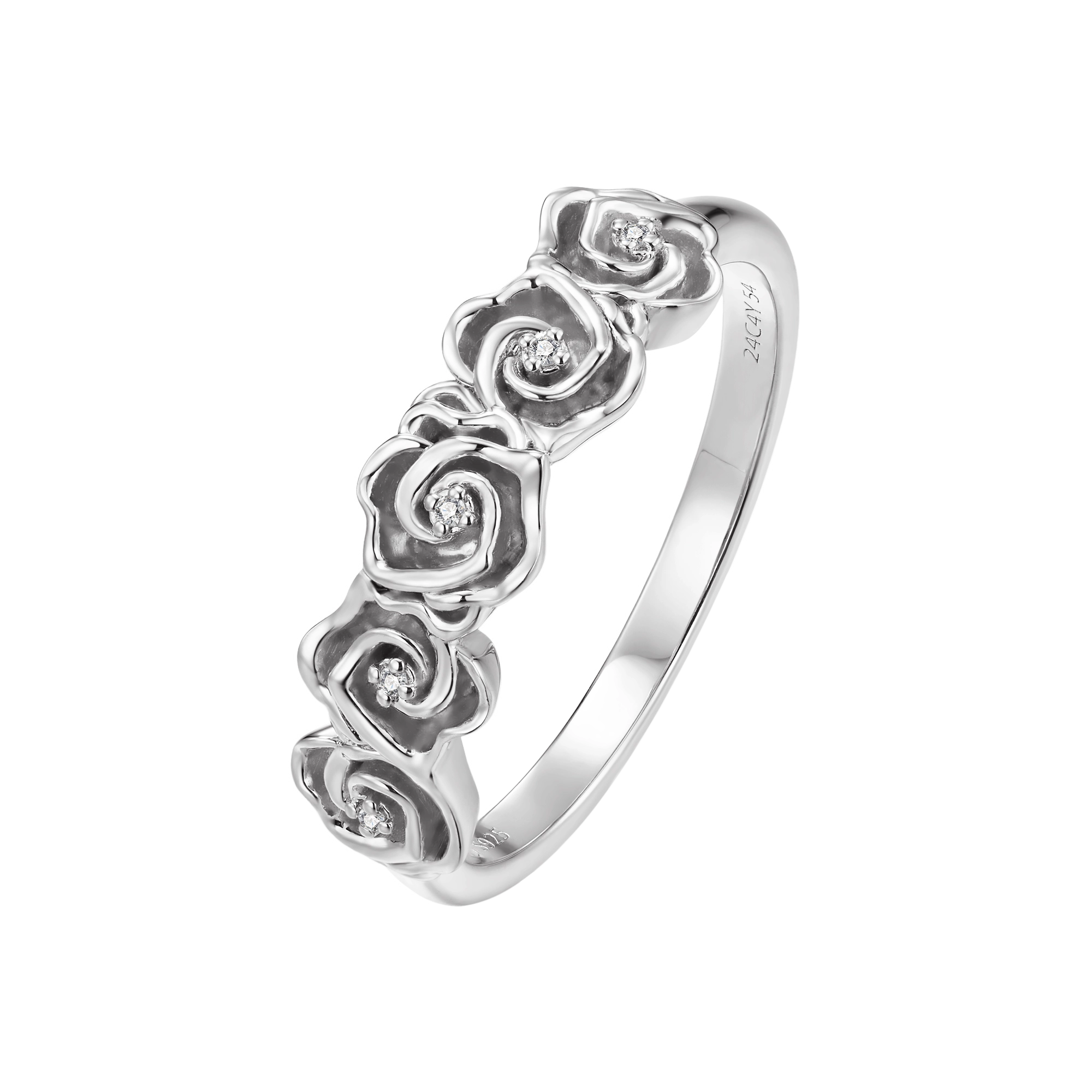 This ring isn’t just a budding tribute to nature; it’s a full-blown floral affair for your soul. A wider band, flaunting 5x lovely rose flowers, each with a natural white diamond at heart. Perfectly balancing boldness and grace, it makes every day blossom with charm.