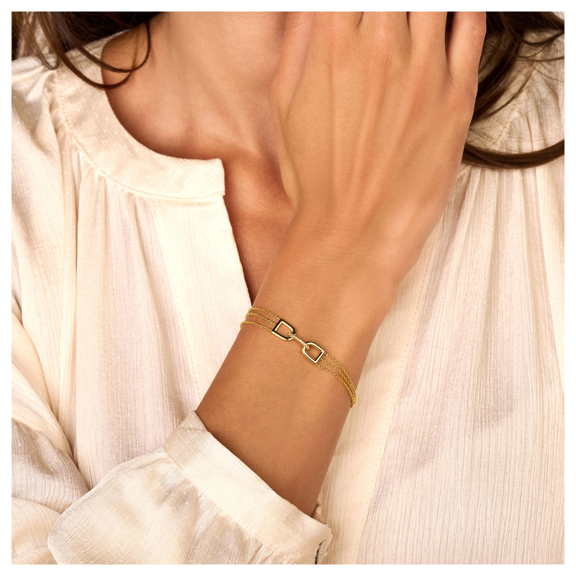 A triple chained bracelet, highlighting a refined center piece of double arches, connected by a paved diamond bridge. Inspired by the shape of enchanting garden gates, you’ll be unlocking a secret scene of beauty and wonder within you.