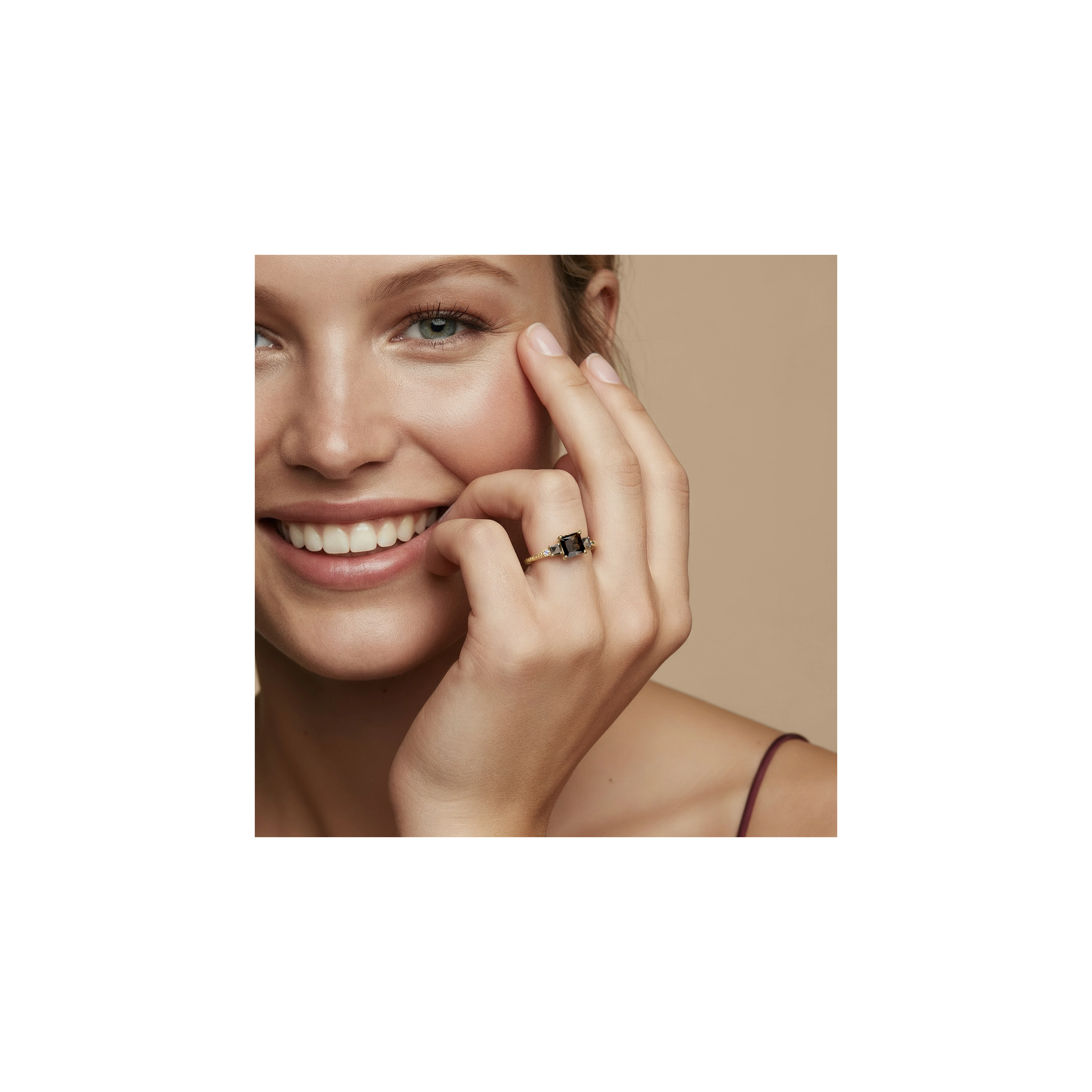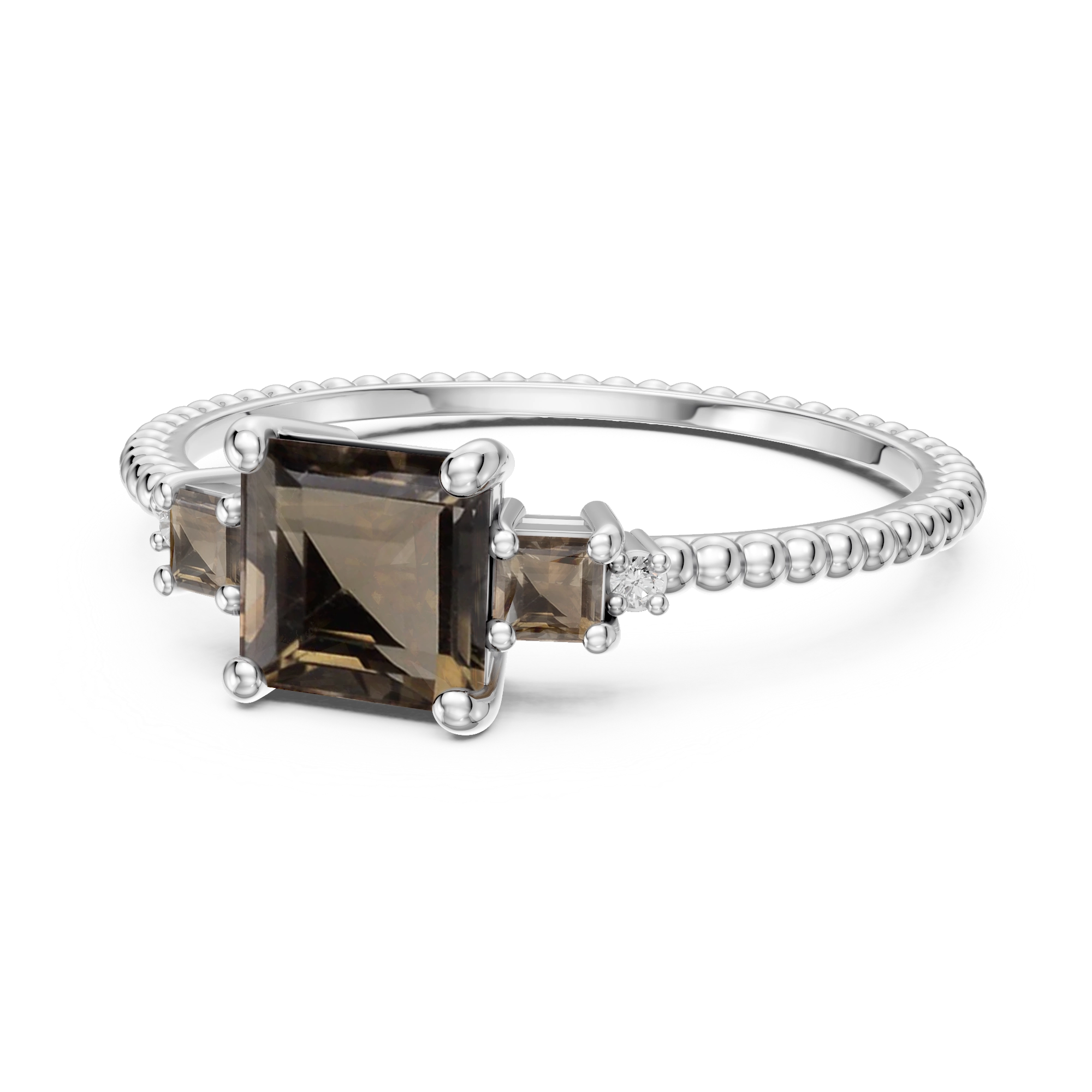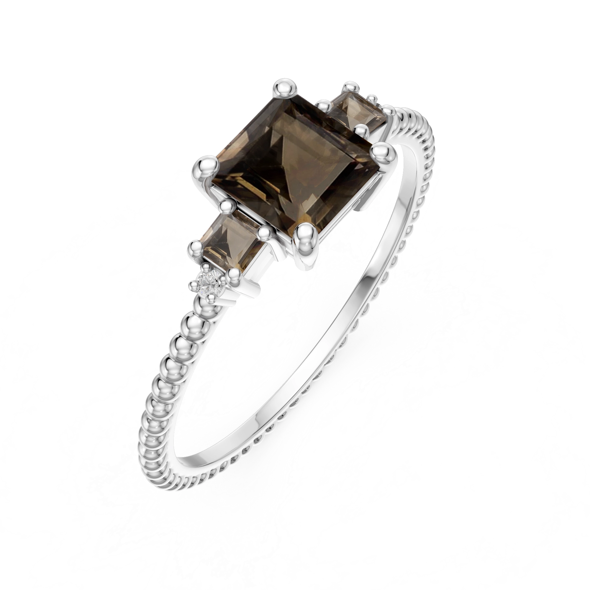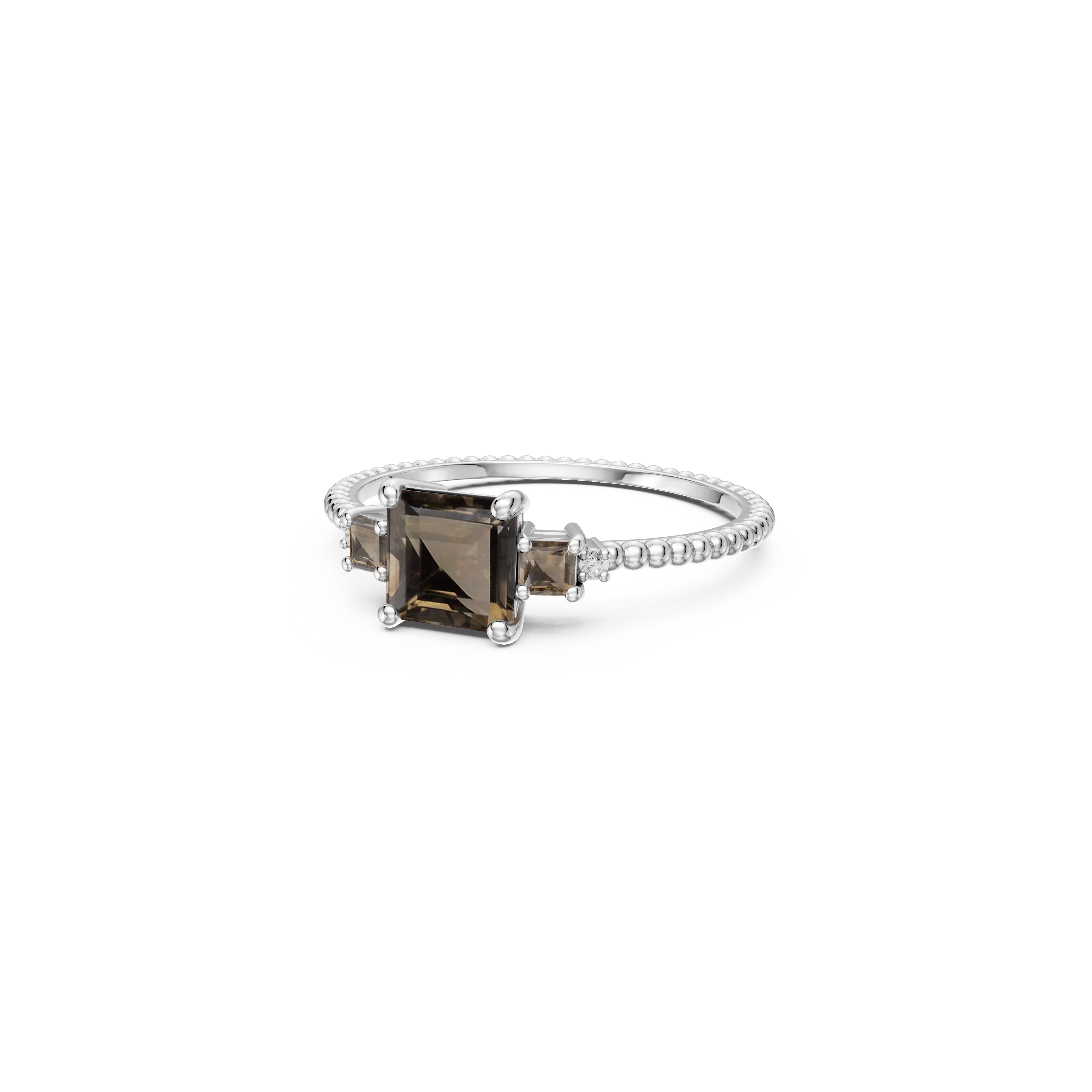 A cutting-edge creation, where a large, deep brown square-cut smokey quartz takes center stage, flanked by two lighter squares shimmering with subtle contrast. On each side, a natural diamond accents the textured shank, reminiscent of the peacock’s structured beauty. Crafted in 925 sterling silver, it’s a design that proves geometry can be irresistibly glamorous.