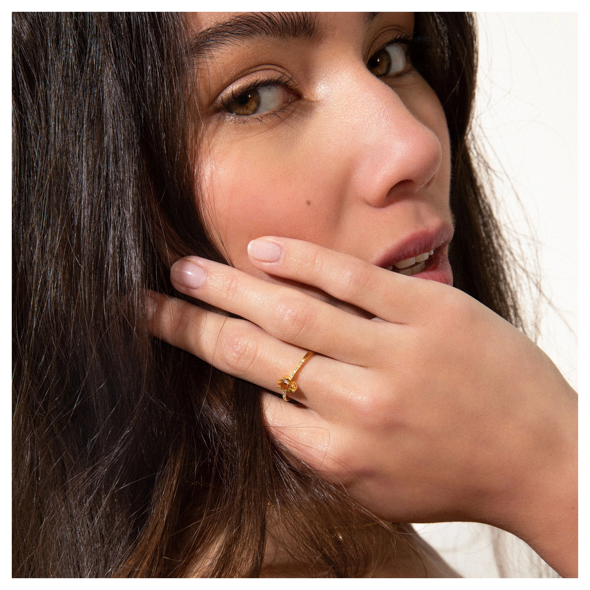 A yellow lemon-like citrine, known as the gemstone of happiness, with 14x handset diamond by its side - shining bright as the glaring summer sun. Our Felice ring sparks everyday joy, even when life gives you lemons. Styling tip: An instant feel good look when paired with our Allure and Hope rings.