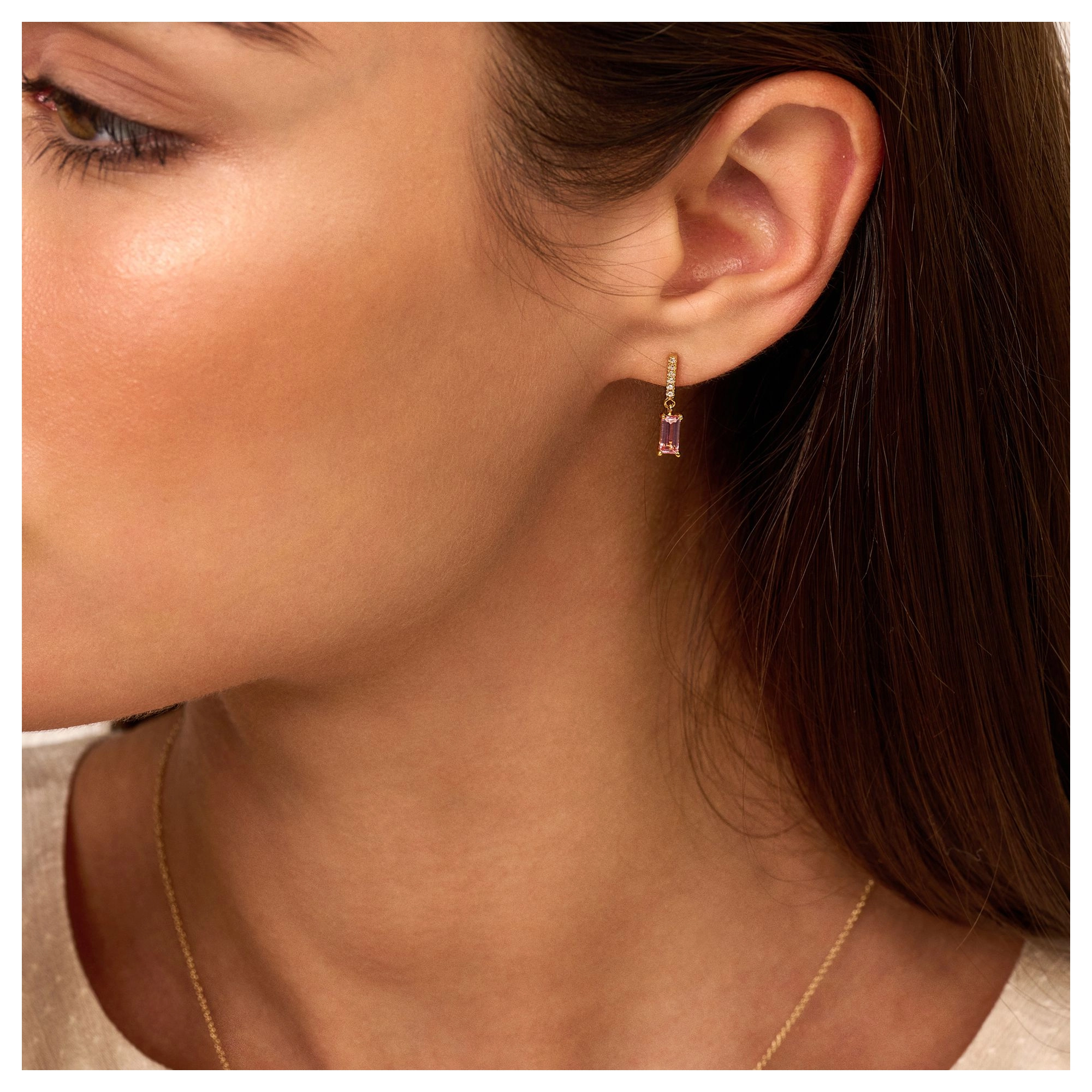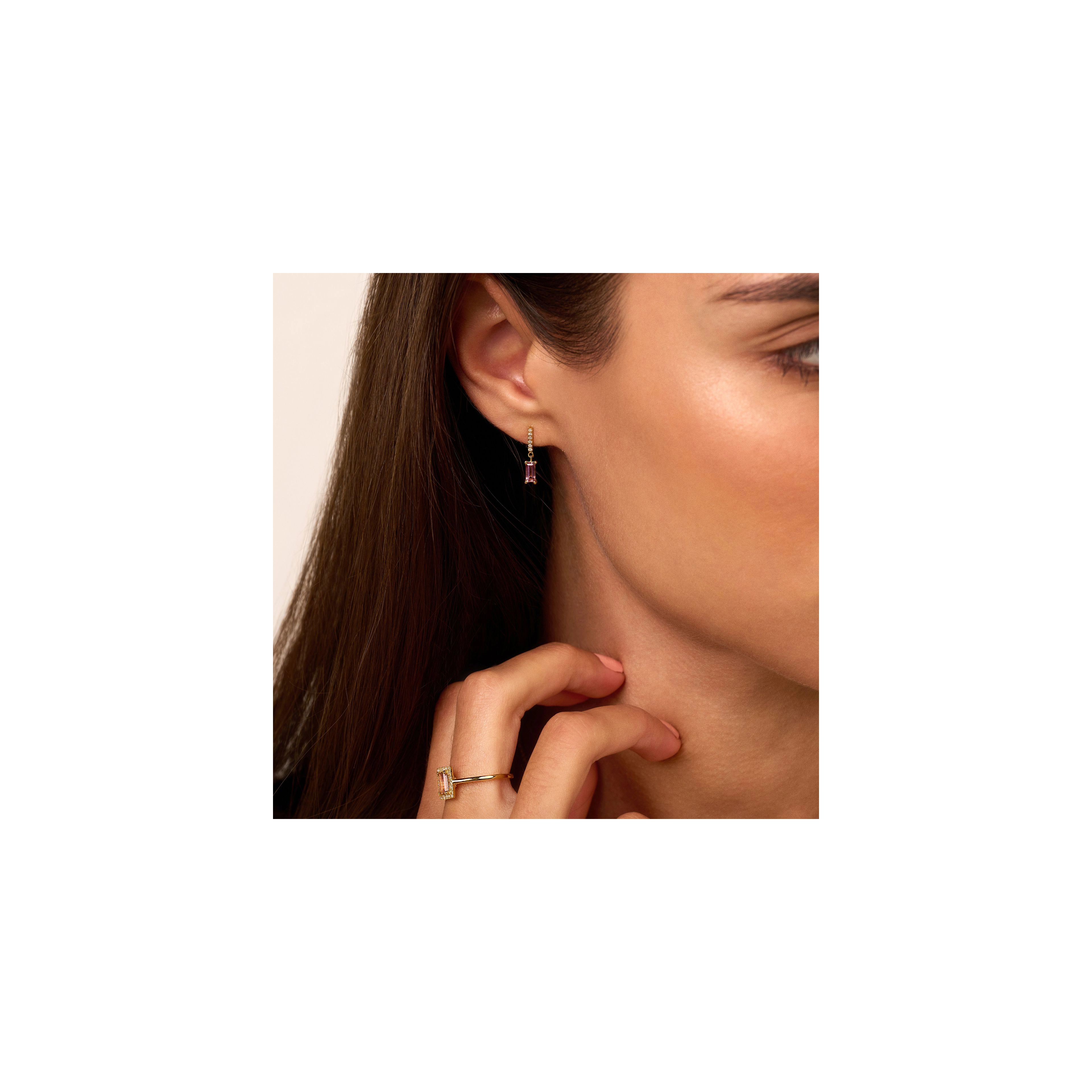 Striking pink Tourmalines add a soft touch to these contemporary and ravishing 14 carat gold earrings. Defining pure beauty as 12x white diamonds catch the playful light of day.