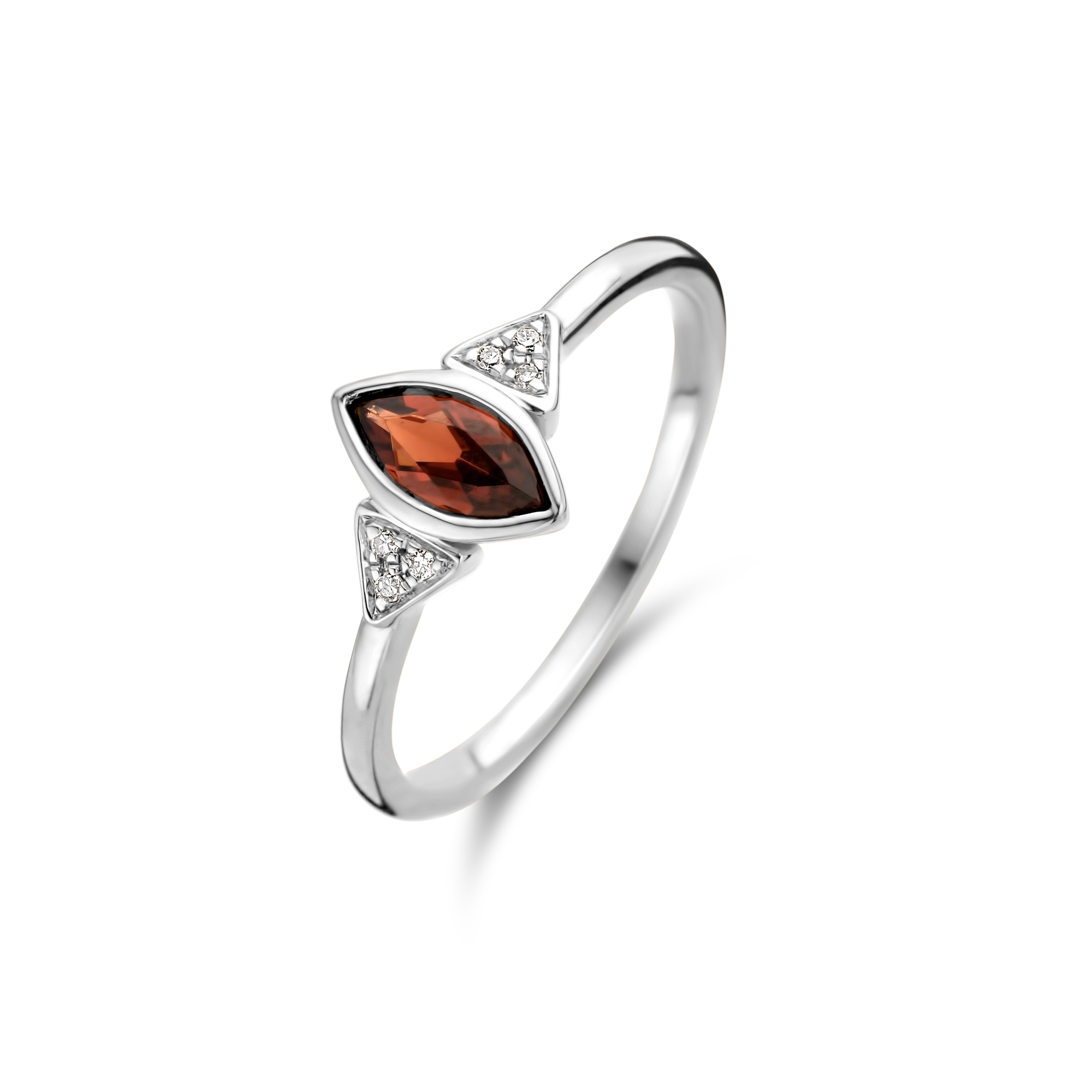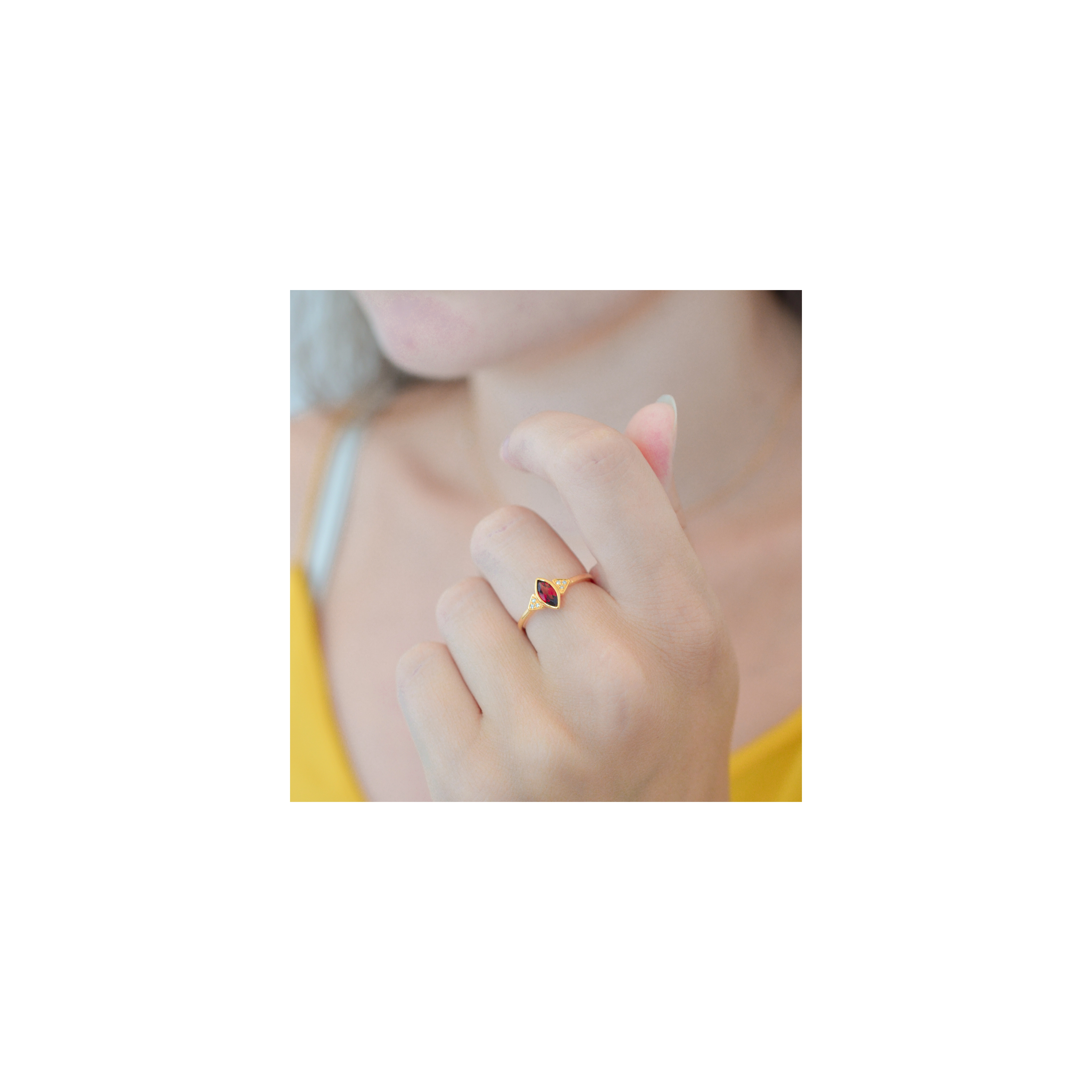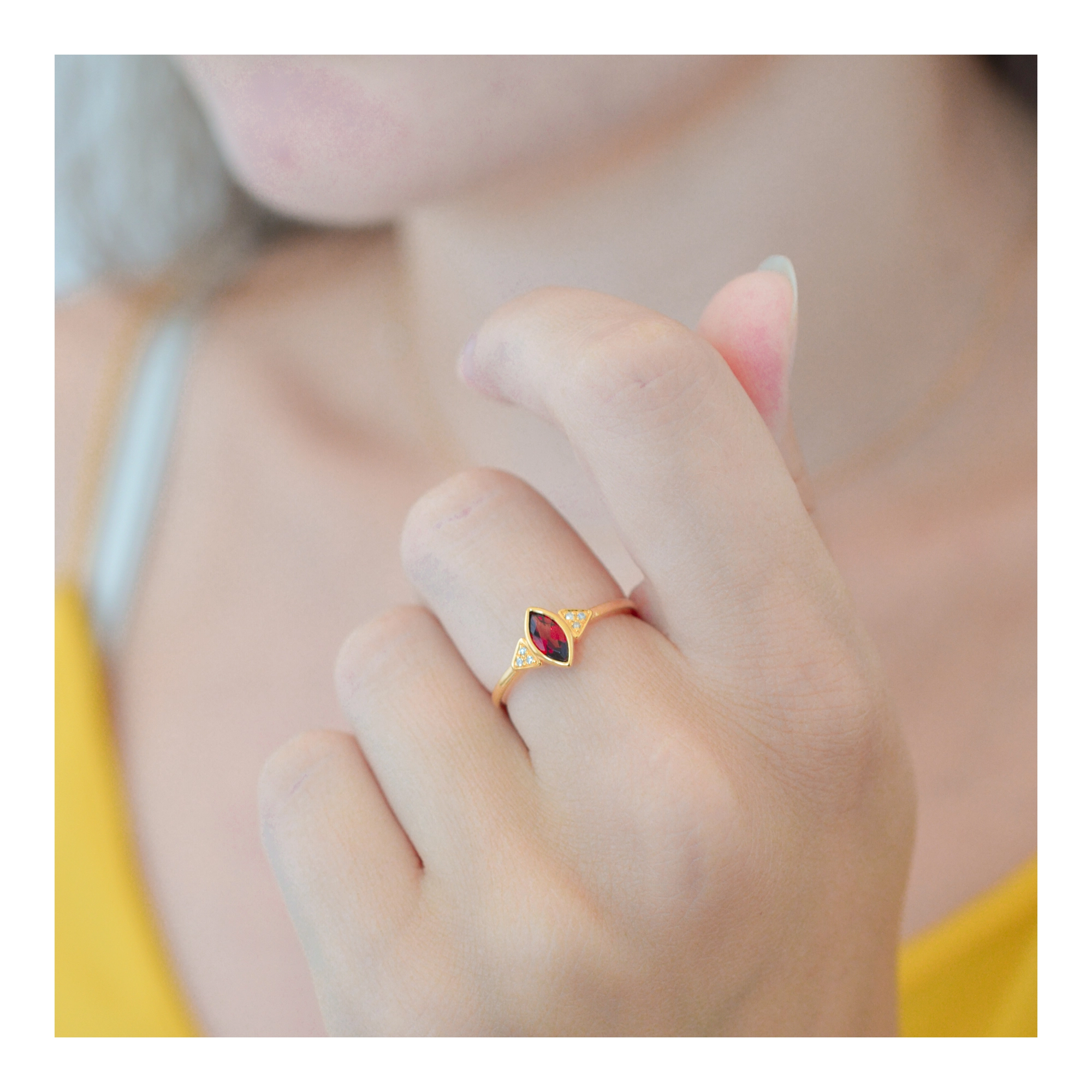 Inspired by Nefertiti – universal icon of femininity and power, renowned for her exceptional beauty. A royal marquise cut red Garnet, embedded in 6x bright sparkling diamonds for a ready-to-rule-your-dynasty-proof look.