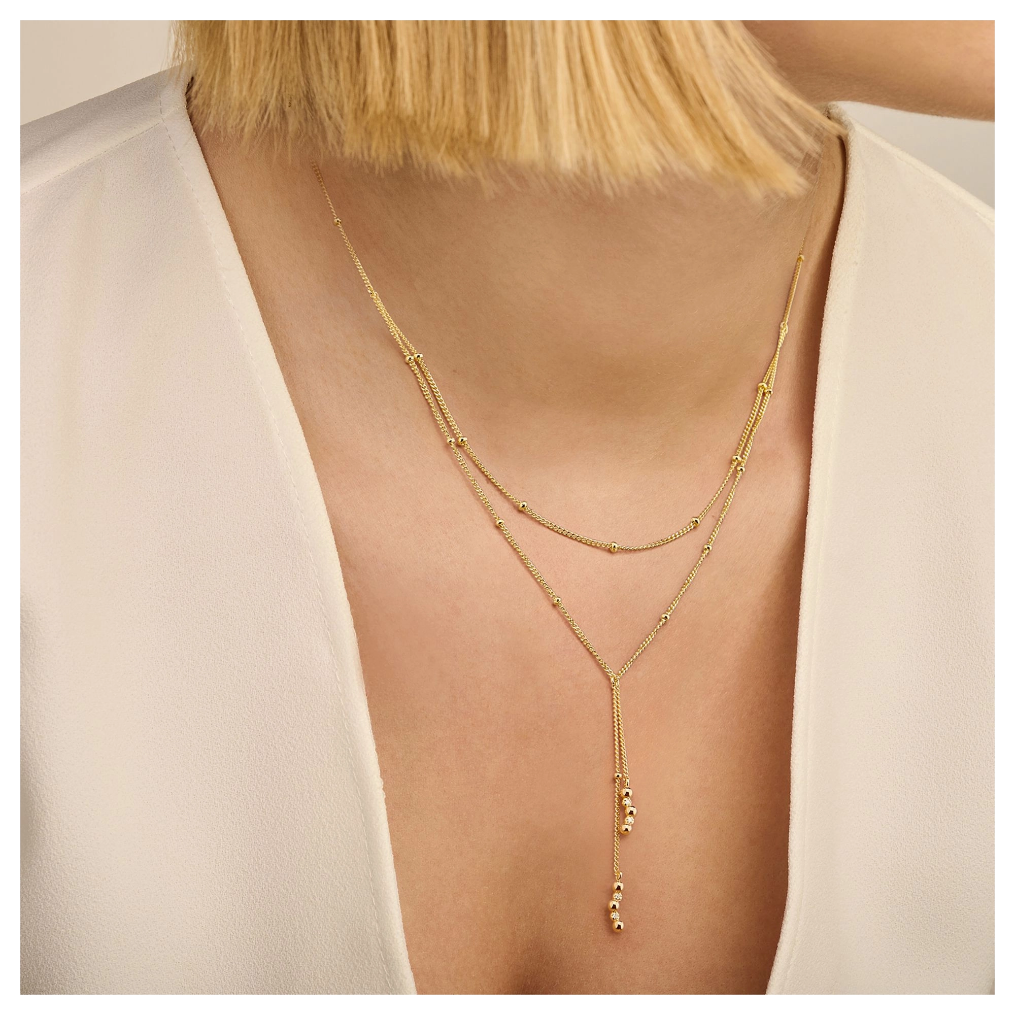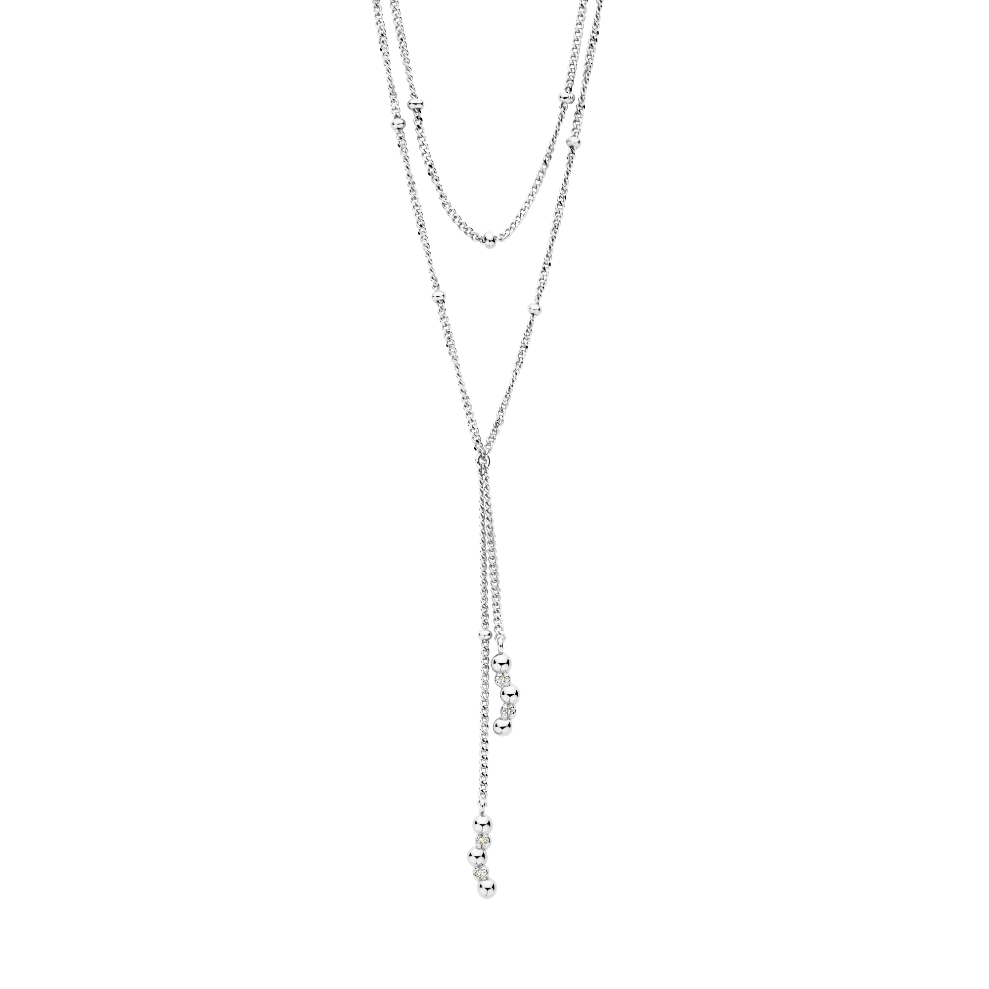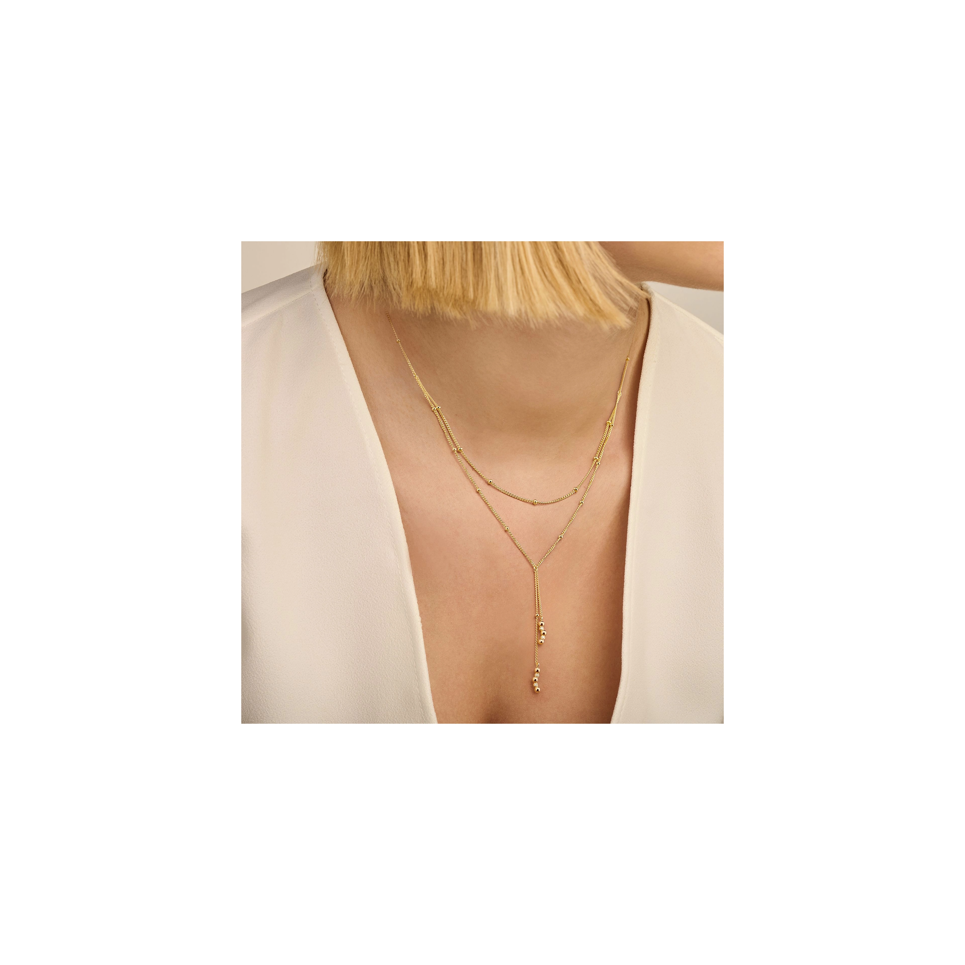 A double beaded chain, tied up with dainty diamond (4x) swinging pendants, – inspired by the calmness of a gentle breeze and soft waves as they break upon the shore. Perfect for a deep-dive into a world of shimmer and those plunging necklines.